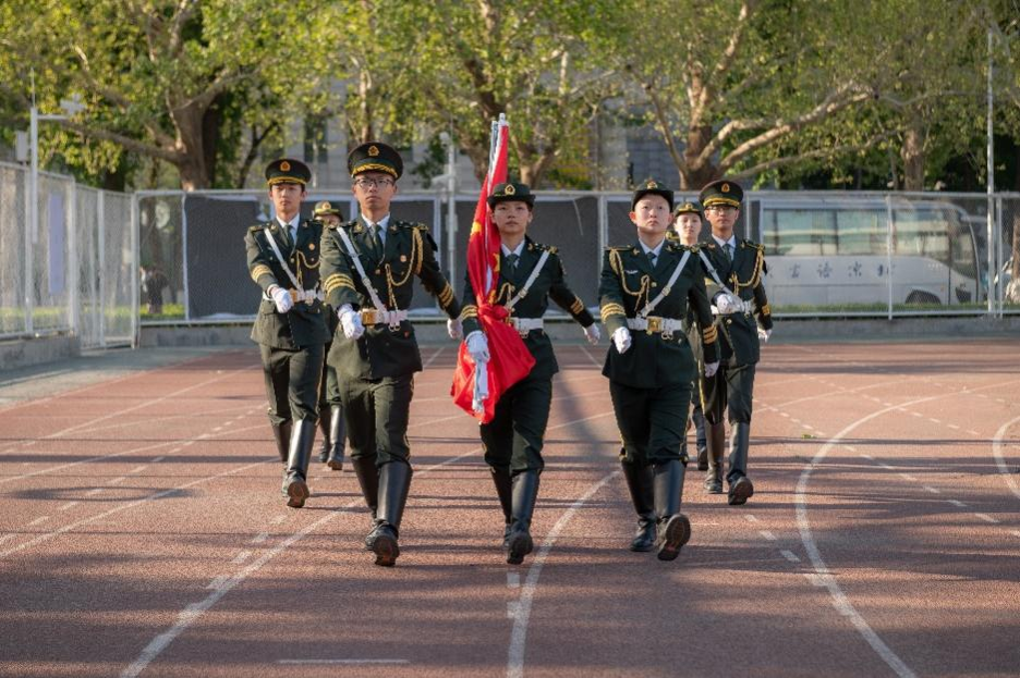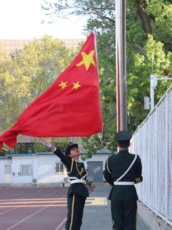 7点30分,升旗仪式准时开始。一轮初升红日映照下,北京语言大学国旗护卫队的队员们礼服笔挺、军姿飒爽,以铿锵有力的正步向升旗台迈进。随着“向国旗敬礼”的口令响起,五星红旗在国歌声中冉冉升起。全体师生庄严行注目礼并高唱国歌,心中激荡深厚的家国情怀。