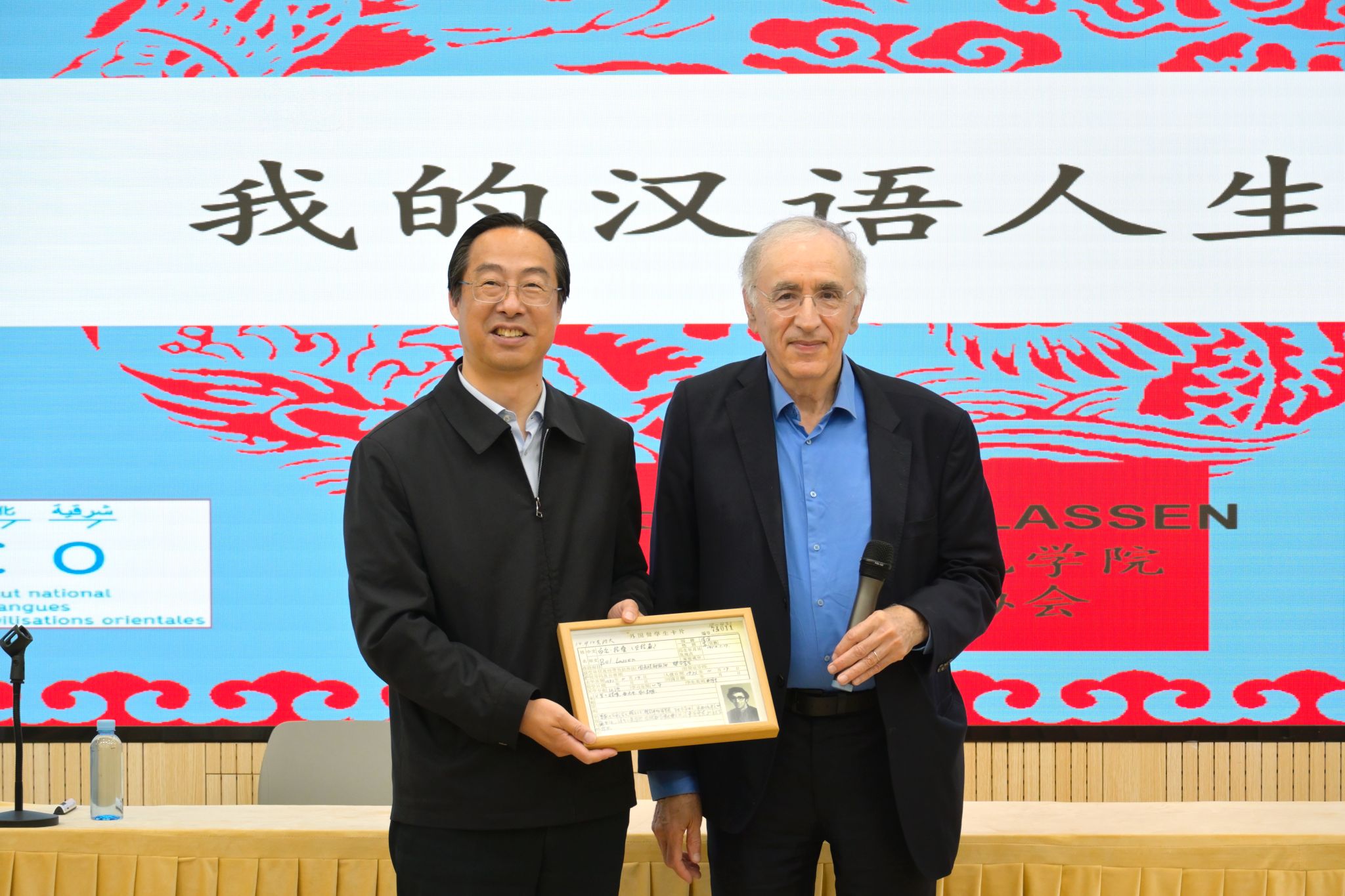 讲座伊始,黄益方会长代表学校校友会聘请白乐桑教授为“北京语言大学法国校友之家筹备委员会主任”,以及赠送白教授1973-1974年在北语学习期间的“外国留学生学生卡片”以及“考试考查成绩登记表”珍贵历史资料,并欢迎白教授常回母校看看。
