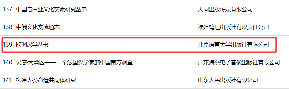 北语新闻网4月22日电(通讯员 出版社 陈显)近日,国家出版基金规划管理办公室公布了2025年度国家出版基金资助项目名单,北京语言大学出版社申报的“欧洲汉学丛书”项目成功入选。该丛书由我校段鹏校长主编,北京语言大学一带一路研究院组稿、翻译,北京语言大学出版社编辑出版发行。此前,段鹏校长主编的“‘一带一路’汉学经典书系”已入选2024年度国家出版基金项目,“欧洲汉学丛书”的入选是我校出版社首次蝉联入围这一国家级重要出版规划项目。至此,我校出版社在“十四五”期间已有三个丛书系列入选国家出版基金项目,共计57个品种。