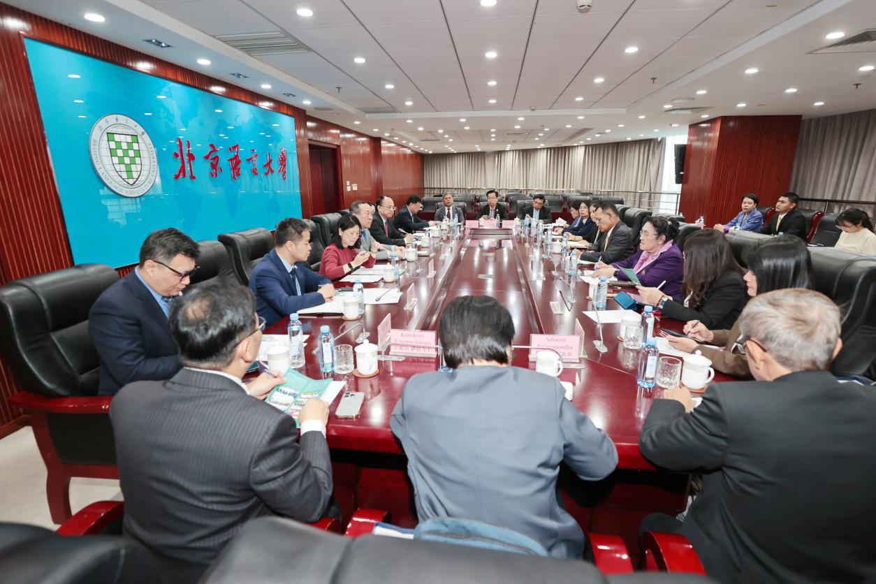 段鹏校长对代表团的来访表示热烈欢迎。他指出,北京语言大学作为新中国最早开展国际中文教育的专业院校,自建校以来,一直以传播中华文化,搭建中外交流桥梁为己任,培养了包括泰国公主诗琳通,前泰国代总理王蓬贴在内的各国政要、驻华使节及各领域的知名人士。学校在泰国成立了北京语言大学曼谷学院,累计培养本科和硕士毕业生747人,非学历教育学员5000余人。学校还在泰国成立了玛希隆大学孔子学院,为泰国民众提供高质量的中国语言文化相关服务,以满足泰国日益增长的中文学习需求,并重点发展商务及医学方面的课程建设,致力于成为“中文+商务+医学”型特色孔子学院。他表示,希望未来进一步拓展与泰国高校的交流合作,培养两国友好使者;期待与泰国一起推动亚洲经典著作互译计划,开展中泰经典文本互译,以书籍为载体搭建文明对话桥梁;与泰国高校互设两国研究院,推进高层次博士研究生联合培养,依托海南的区位优势搭建双边学术研究平台,培养具有国际视野、跨文化沟通能力与创新科研能力的高层次人才。
