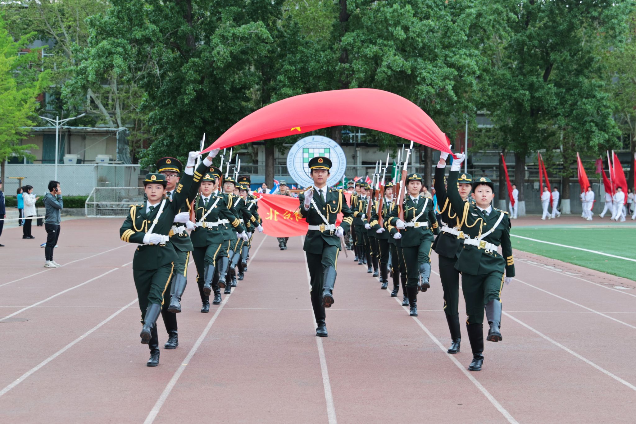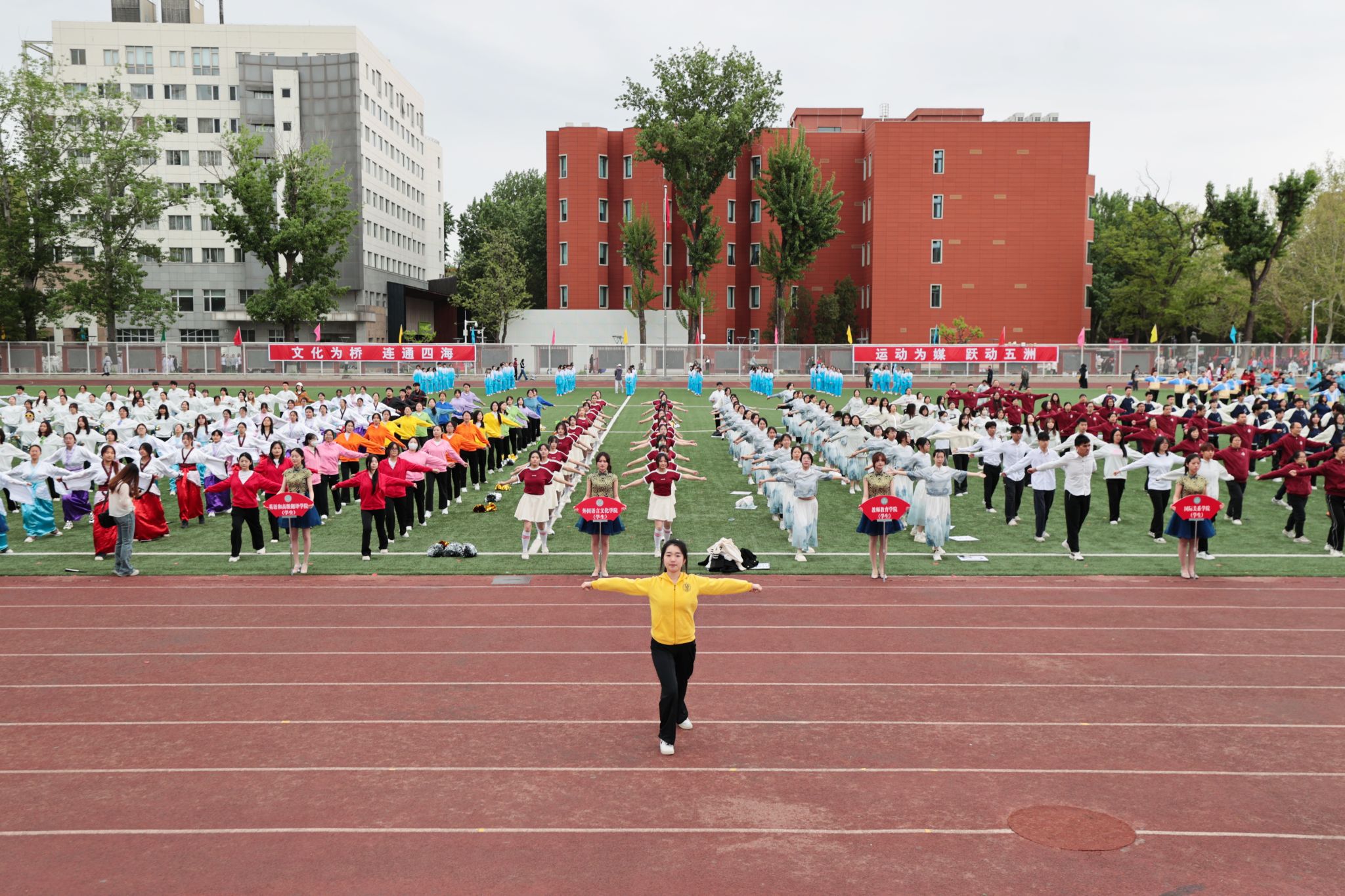 上午8时,开幕式在激昂的进行曲中拉开帷幕。国旗护卫队步伐整齐,步履铿锵;旗阵英姿飒爽,气宇轩昂;由留学生组成的方阵手持五彩国旗,尽显“小联合国”的多元魅力与青春活力;38支师生代表队依次入场,各具特色,创意展演精彩纷呈,焕发出别样的活力风采与团队凝聚力。