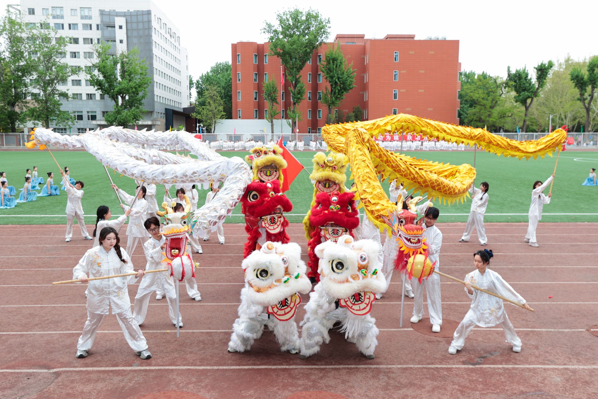 开幕式表演环节高潮迭起。近千名师生齐演“第九套广播体操”,动作整齐划一,气势如虹,展现出青春的活力;陈式太极拳刚柔并济,一招一式尽显传统武术的韵味与魅力,诠释了内外兼修的武学追求;校龙狮队的“师舞龙腾”灵动矫健,巨龙翻腾,带来强烈的视觉冲击;校艺术体操队的“星河鹭起”柔美如画,如诗如梦,诠释出星河的浩瀚与神秘;跆拳道协会的表演“跆风”强劲有力,动作干脆利落,迸发出百折不挠的青春锋芒;大一本科生的杨式16式太极拳舒缓流畅,行云流水,传承着传统文化的精髓,赓续着年轻一代薪火相传的文化使命;最后,校领导与学生组成“超能战队”,同心协力完成同心圆挑战,将现场氛围推向高潮。