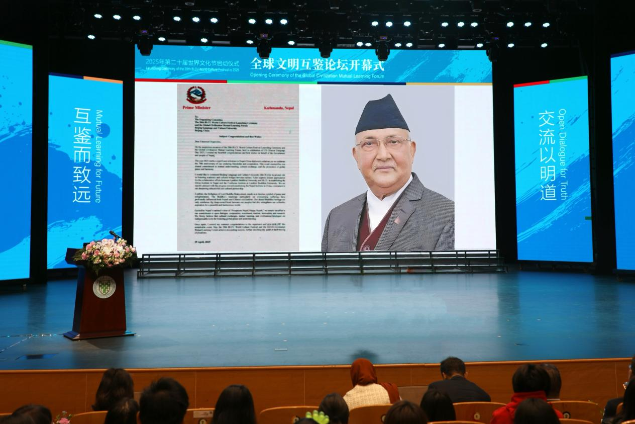 本次活动得到了各国领导人的高度关注。尼泊尔总理奥利阁下、前总统班达里阁下也专程向本次活动发来贺信。奥利总理在贺信中指出,2025年是中尼外交关系的重要里程碑,两国共同迎来了持久友谊与合作的70周年华诞。本届文化节与全球文明互鉴论坛充分彰显了中尼双方对深化相互理解、推动文化交流,以及促进全球和平与和谐的共同承诺。他高度赞誉了北京语言大学在促进各国学术与文化交流中发挥的关键作用,特别是与蓝毗尼佛教大学携手合作,在尼泊尔共同设立中国研究院,并在蓝毗尼佛教大学设立孔子学院。这一系列成果正是两国教育文化伙伴关系不断深化的有力见证。他坚信,文化交流、互学互鉴与文明对话,是推动全球和平与增进相互理解的必由之路。尼泊尔将始终坚定推进与中国的开放对话与务实合作,鼓励创新突破、加强学术研究,更好造福两国和两国人民。