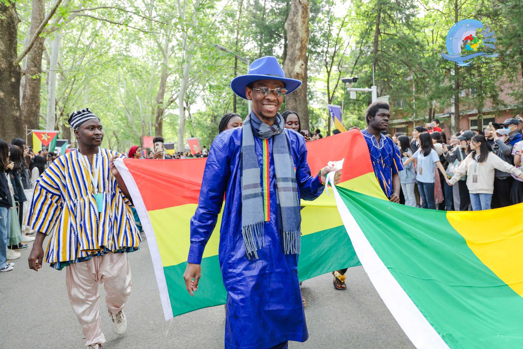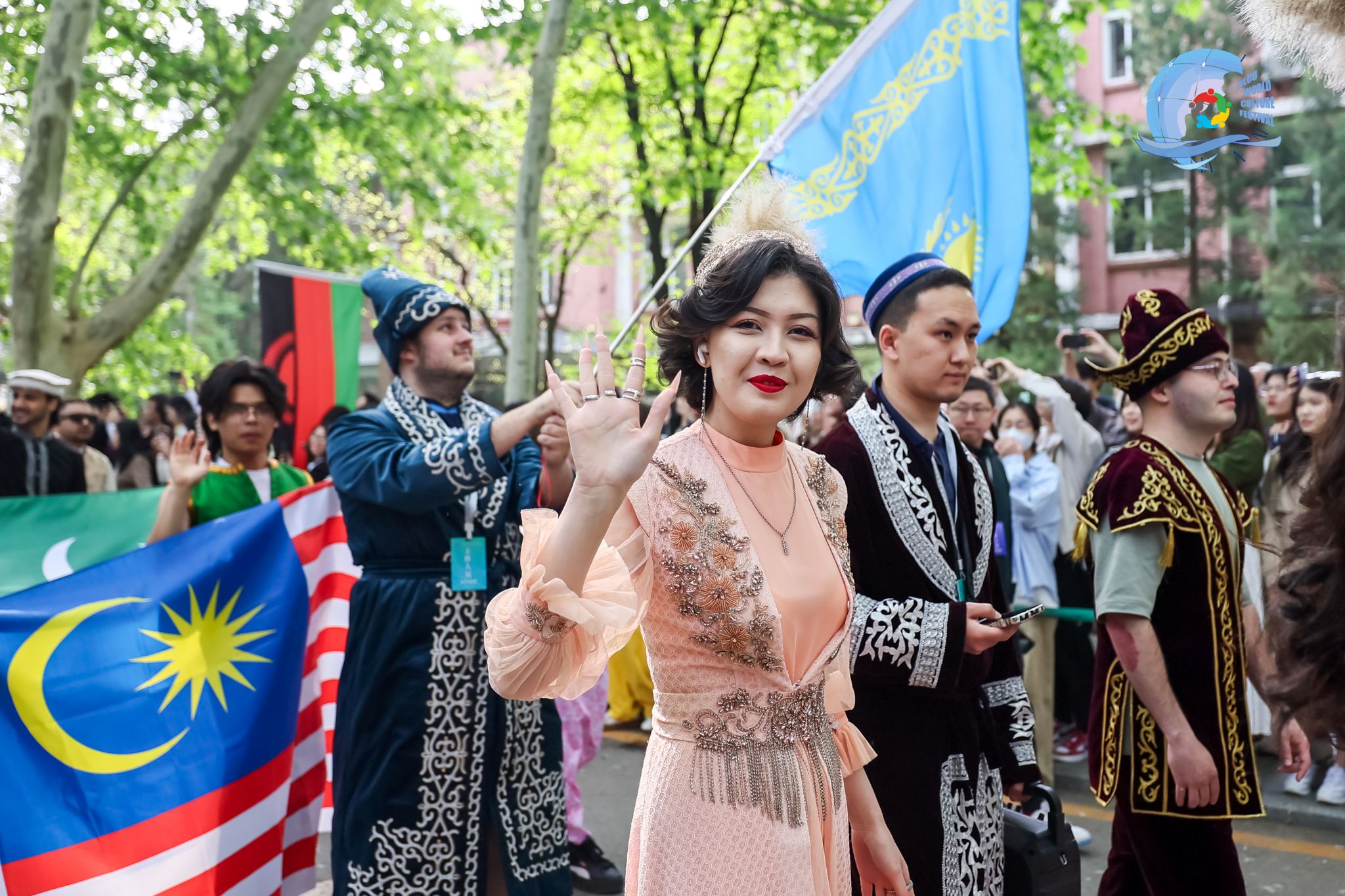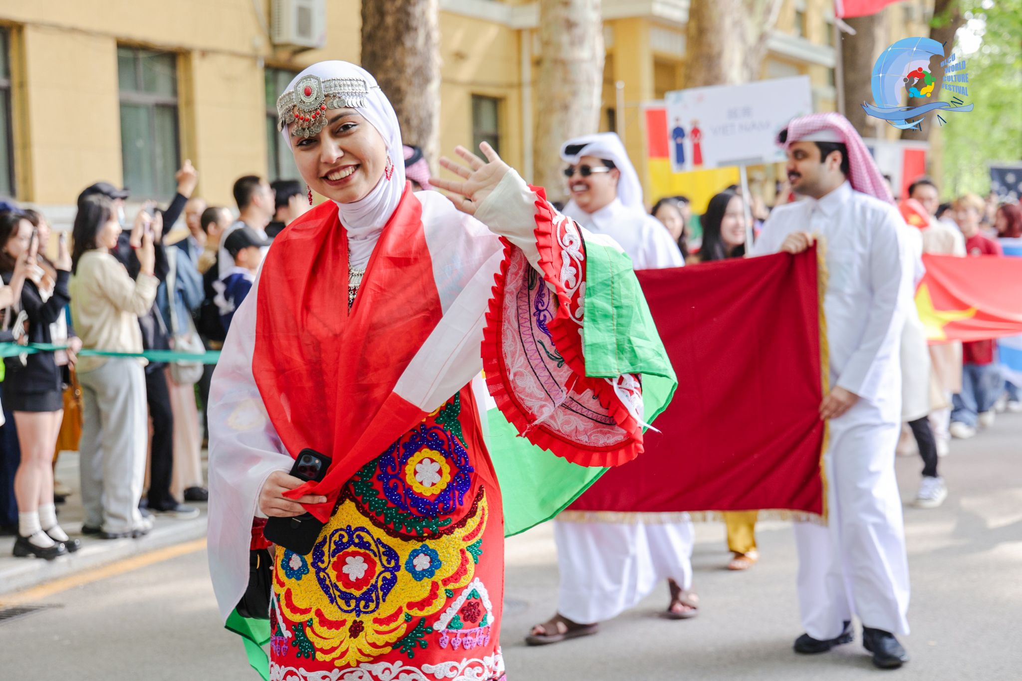 由300多名来自五大洲的学生组成的巡游队伍,拉开了第二十届世界文化节游园会的序幕。中外学生身穿各具特色的民族服装,踏着昂扬的步伐,穿梭于万国旗间,共同绘就多元文化共融的青春图景。