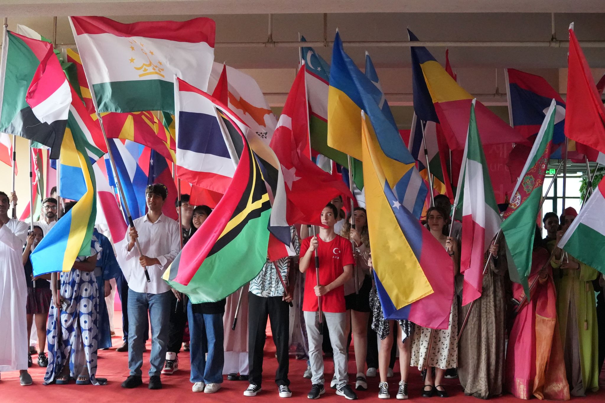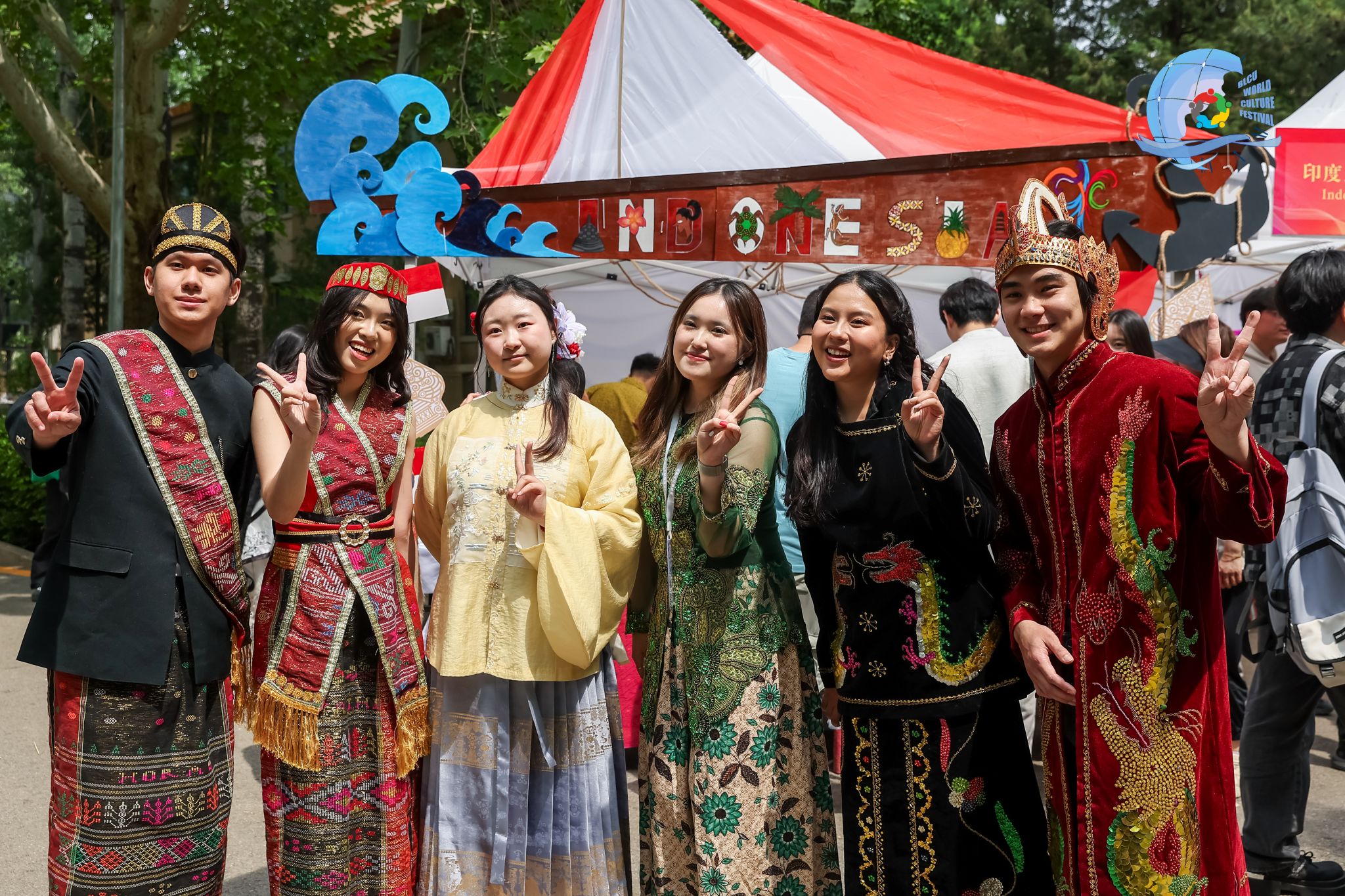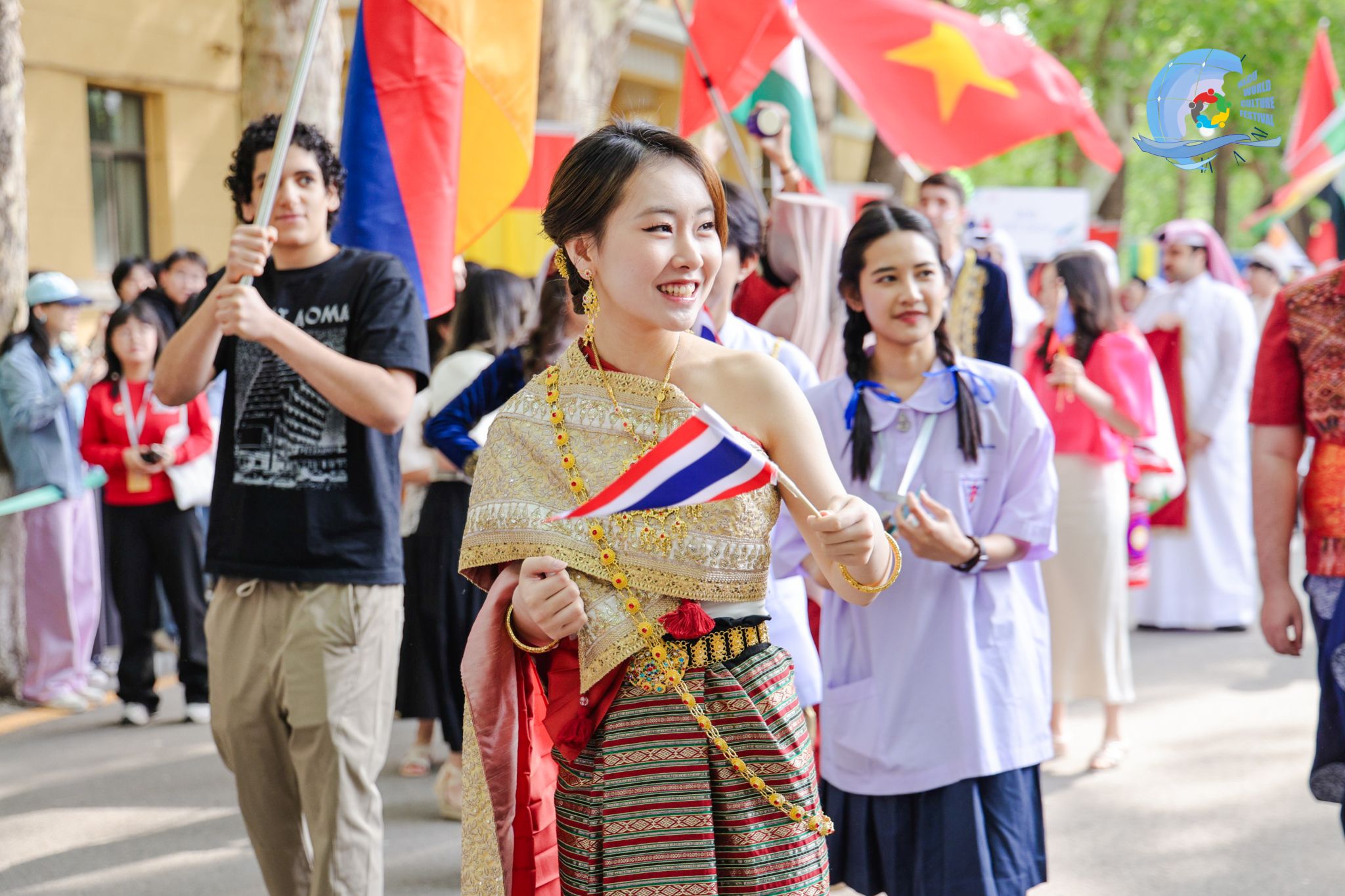 由300多名来自五大洲的学生组成的巡游队伍,拉开了第二十届世界文化节游园会的序幕。中外学生身穿各具特色的民族服装,踏着昂扬的步伐,穿梭于万国旗间,共同绘就多元文化共融的青春图景。