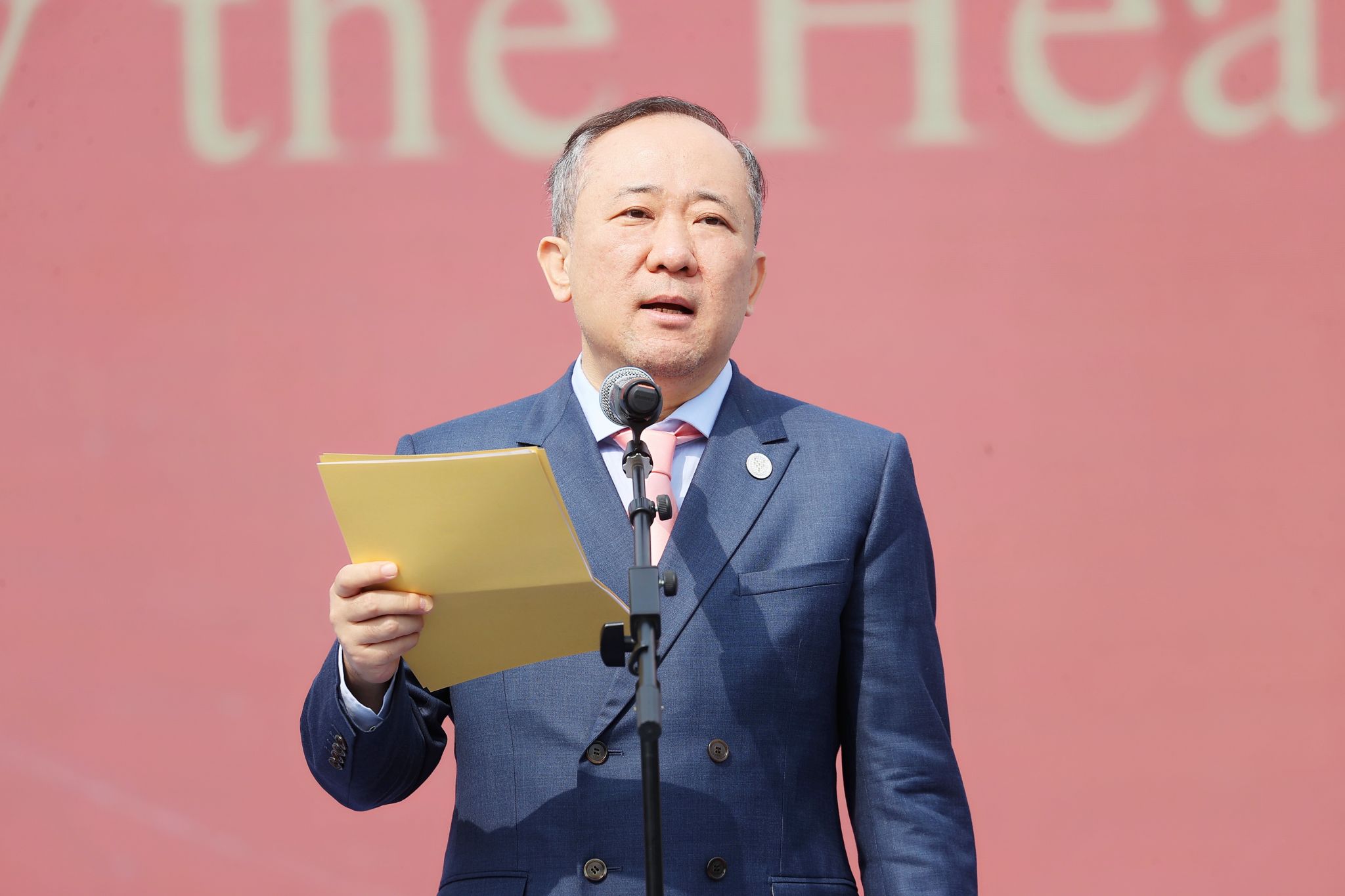 校长段鹏致辞。他表示,二十年来,世界文化节已成为北京语言大学一年一度的文化盛事,依照中国的传统,今年是世界文化节的成年礼。值此盛会,各国友人因文化交流的美好愿景而相识相遇,因中华文化的开放包容而携手并进,因合作共赢的发展潮流而共创新篇。面向未来,学校真诚希望以文化为媒、友谊为桥,汇聚世界友人的智慧和力量,弘扬中华优秀传统文化,深化文明交流互鉴。北京语言大学真诚邀请全球伙伴走进北语,共享发展机遇和美好前景,共赴高质量发展新的春天。