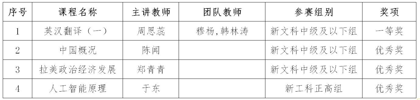 北语新闻网6月3日电(通讯员 谢业海)近日,北京市教育委员会公布了第五届北京高校教师教学创新大赛(以下简称“大赛”)的获奖结果,我校4位(个)教师(团队)获奖:英语和高级翻译学院周思蕊老师团队获得一等奖,将代表北京高校继续参加全国高校教师教学创新大赛,成为学校首次获得北京高校教师教学创新大赛一等奖并晋级国赛的教师团队;应用中文学院陈闻老师、外国语言文化学院(区域国别研究院)郑青青老师、信息科学学院于东老师获得优秀奖。我校获优秀组织奖。