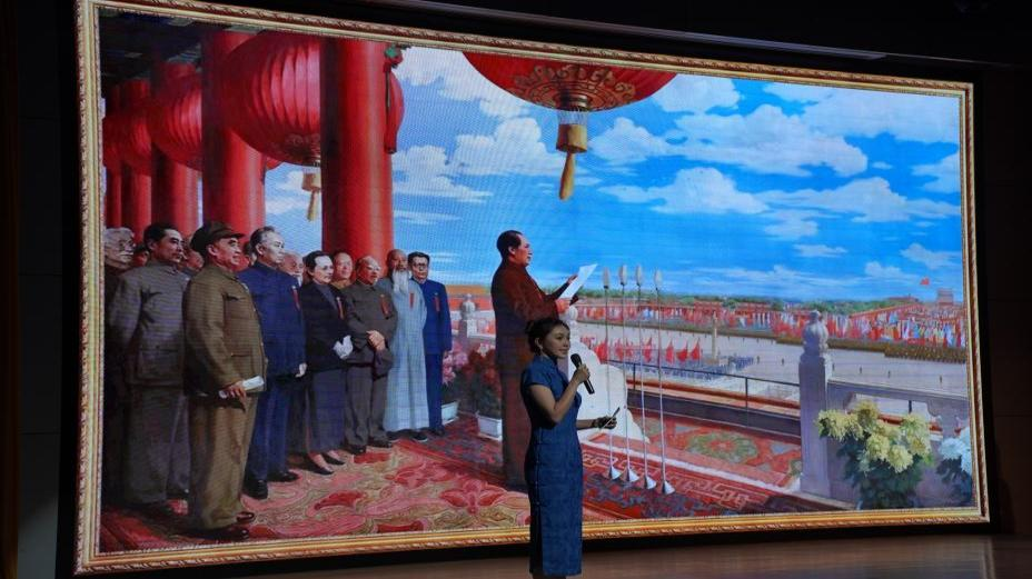 步入“建设年代”展厅,《开国大典》油画以细腻笔触重现历史瞬间,让人心潮澎湃;悠扬的《春到湘江》竹笛演奏,如春风拂面,传递出新中国成立后热火朝天的建设热情。