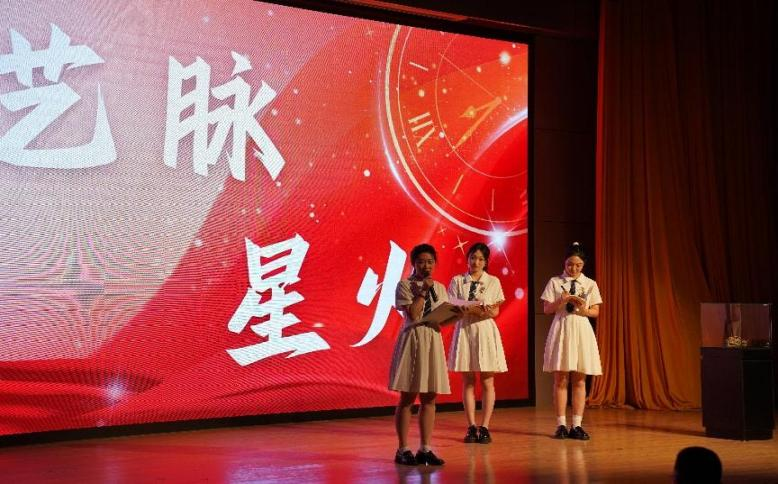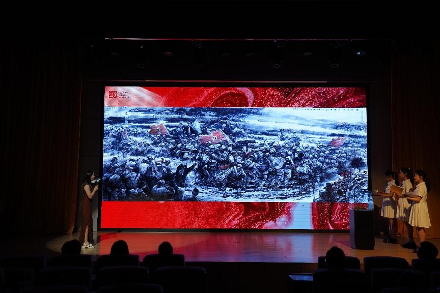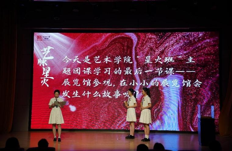 整场活动以一名讲解员引领两位“星火班”团课成员参观展览馆为叙事主线,沿着“觉醒年代”“建设年代”“复兴年代”的时间脉络徐徐展开。每一个展厅,都化身成时光的窗口,通过讲解员对书法、绘画、音乐作品的精彩诠释,生动勾勒出不同历史时期党的发展画卷,让同学们在艺术之美中感悟党的光辉历程。