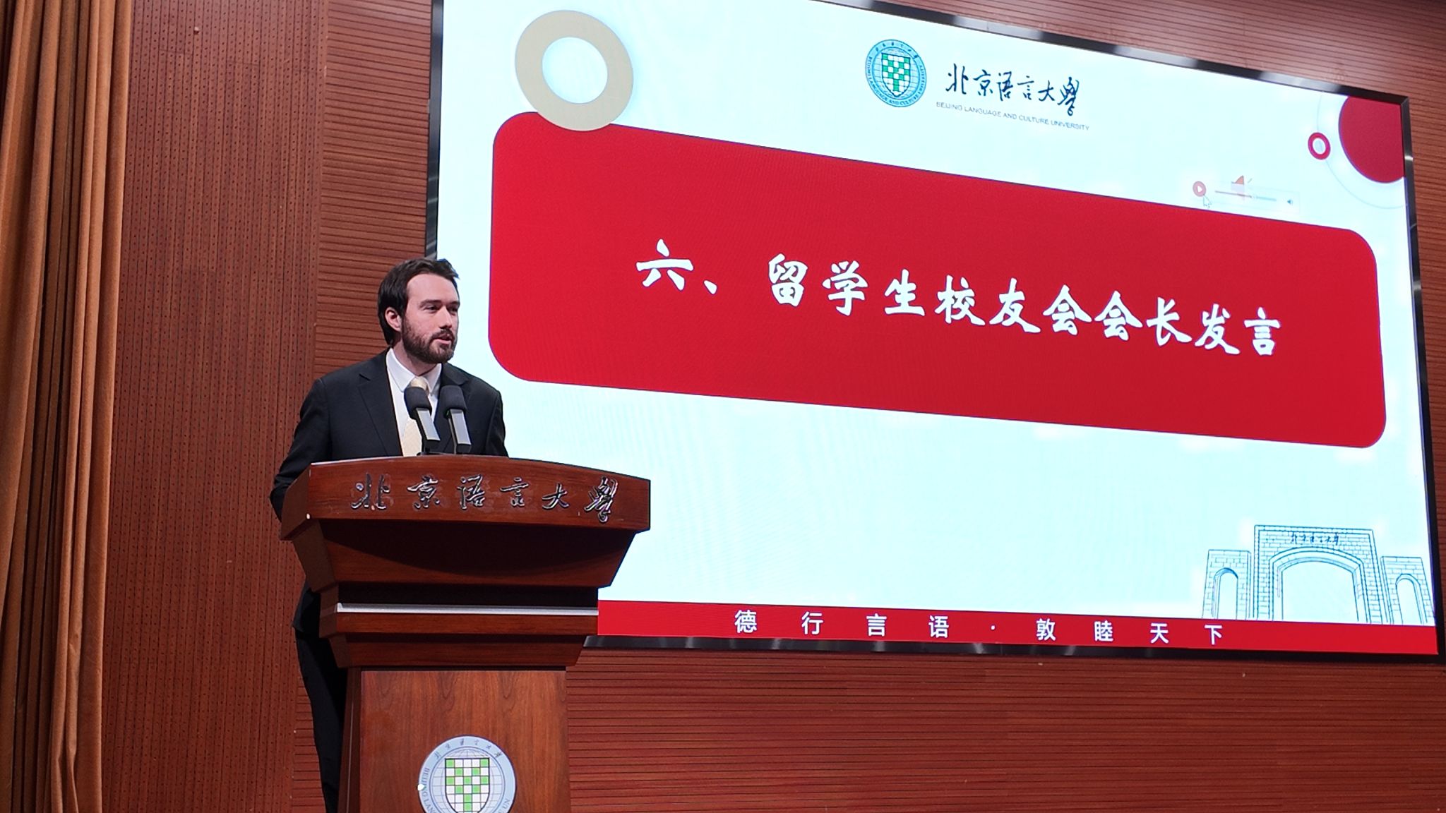 国际中文学院留学生校友会会长、巴西投资促进局亚太办公室总经理维克多在发言中深情回顾了与北语的深厚情缘。他形象地将北语赋予他的收获比喻为三把珍贵的“钥匙”:开启汉字迷宫的钥匙、将“你好”升华为“你真好”的沟通智慧、在规则中寻找弹性并在差异中建立信任的处世哲学。维克多强调,校友会将积极发挥桥梁作用,搭建友谊平台。他还分享了自己在北语与爱人相识相恋的幸福故事。