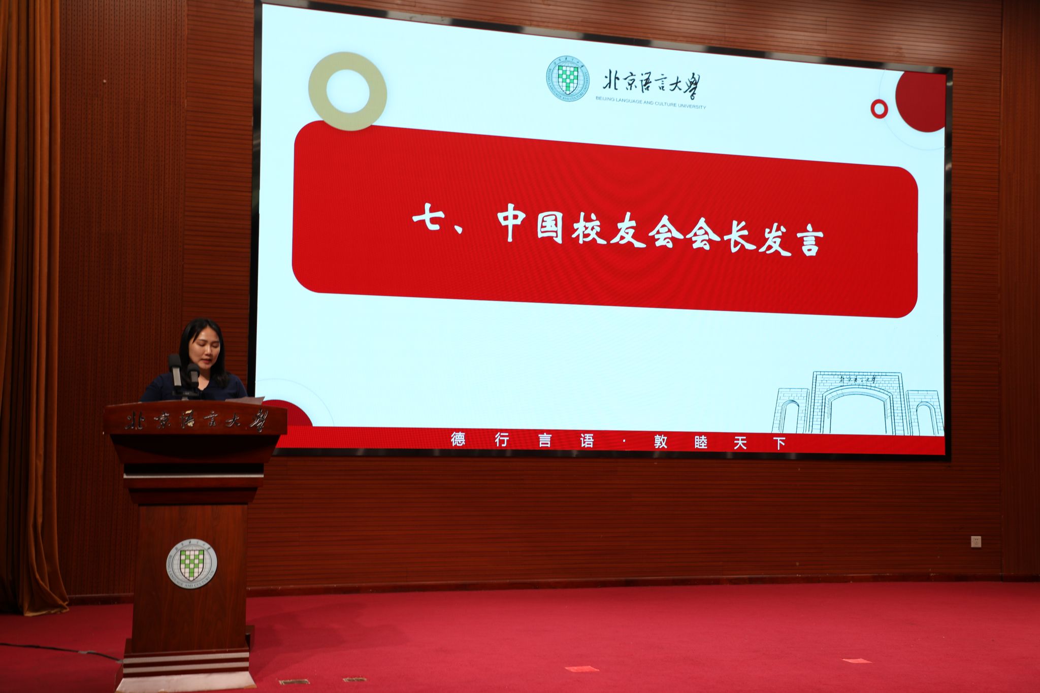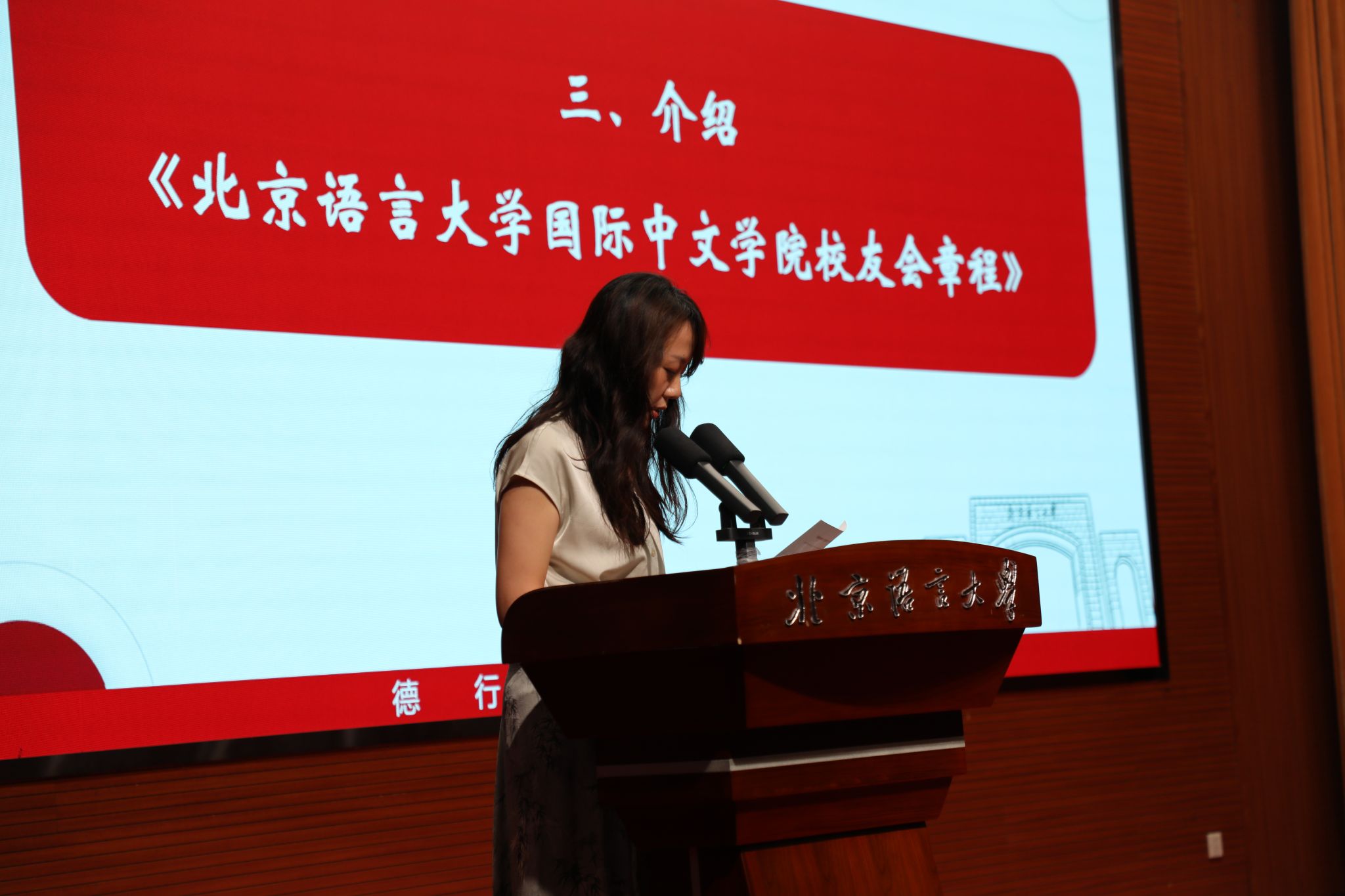 国际中文学院党委书记梁彦民宣读了国际中文学院校友会理事会成员名单。校友会秘书处秘书长、教育基金会秘书处秘书长罗立祥为理事会成员颁发了聘书。学院组织员高美娟介绍了《北京语言大学国际中文学院校友会章程》。