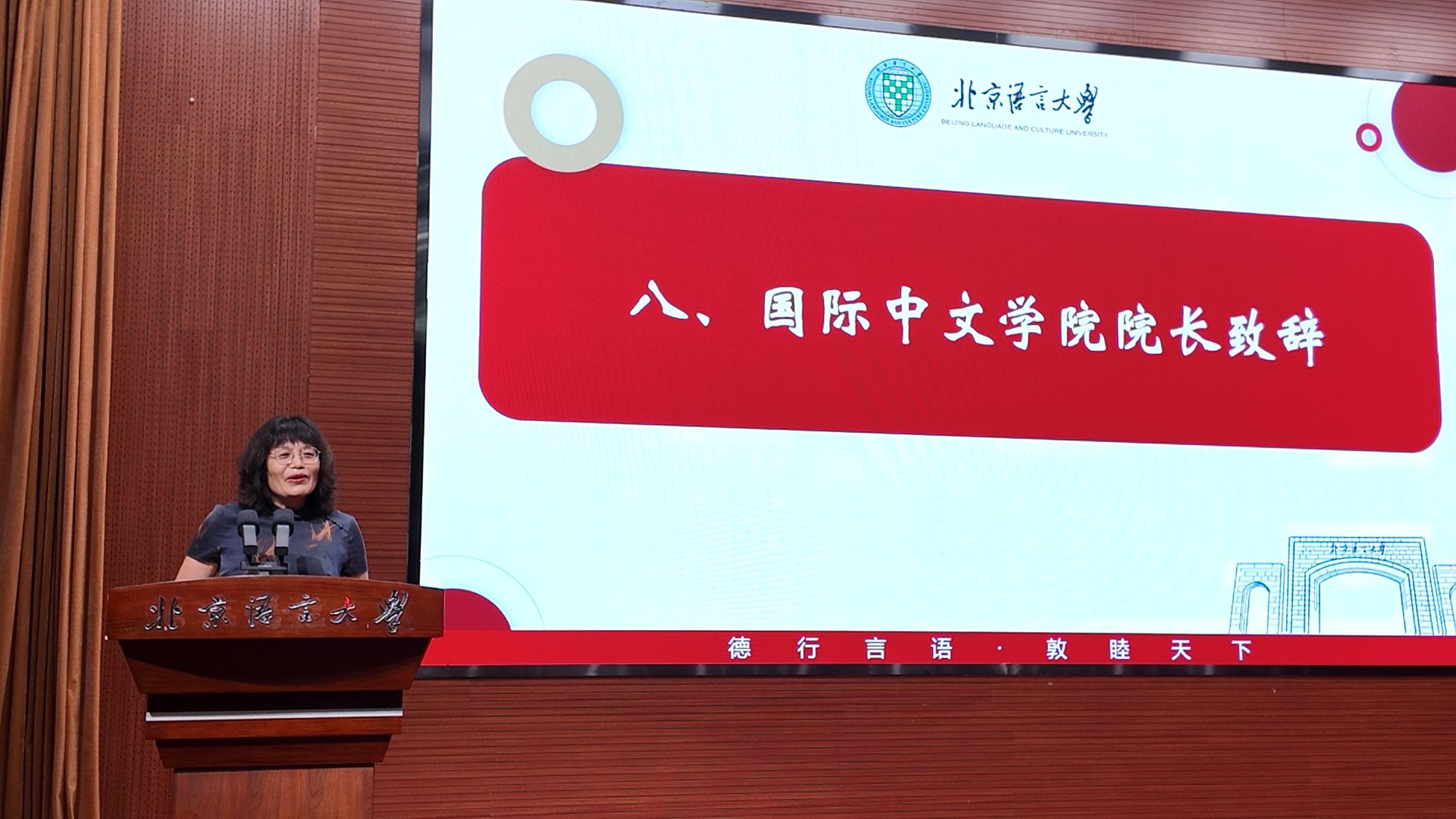 大会最后,国际中文学院院长沈庶英致辞。她指出,校友是学校人才培养的重要成果,国际中文学院始终致力于将学子培养成优秀人才。她强调,校友更是学校闪亮的“名片”,众多优秀校友在世界各地积极贡献社会,彰显了学校的办学实力。沈庶英院长表示,北语不仅是传播中国语言与文化的平台,更是世界文明交流碰撞的场所。她深情期待广大校友心系北语、心系国际中文学院,常回母校相聚,共同见证母校发展新篇章。大会在热烈而温馨的氛围中圆满落幕。校友会、教育基金会秘书处负责人,学院班子成员、教师代表、校友代表及2025届毕业生共同参加大会。