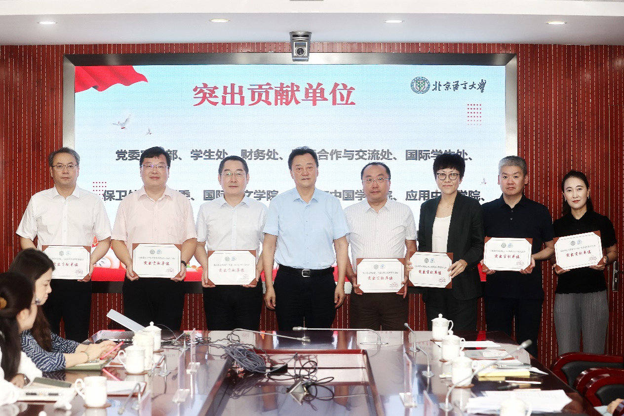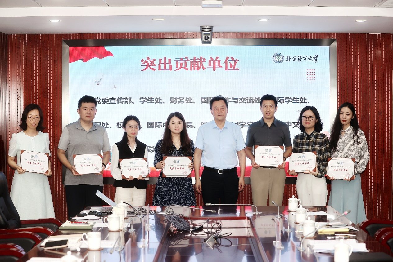 倪海东书记为“第二十届世界文化节突出贡献单位”颁奖,包括:党委宣传部、学生处、财务处、国际合作与交流处、国际学生处、保卫处、校团委、国际中文学院、汉学与中国学学院、应用中文学院、后勤服务集团、北语法盟、出版社、北语留服共14个单位。世界文化节领导小组各单位负责人参加本次会议。