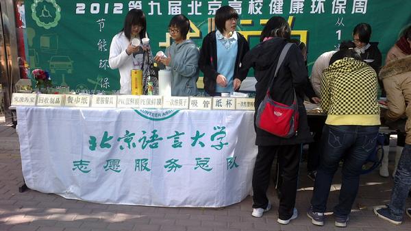 “2012第九届北京高校健康环保周”活动已于9月19日开幕。10月31日中午,此次环保周系列活动之环保物品校园展示在我校宿舍楼下宣传栏正式开始。对于如何辨别很多生活中的小物品的伪劣,例如一次性筷子,吸管,纸杯,保鲜膜,餐巾纸,餐盒,环保部的志愿者都会给你耐心的解答。活动一开始,便吸引了大量同学的目光,许多同学都走到展台前,询问有关环保的小知识,好奇地去参观那些变废为宝,循环再利用小手工物品。