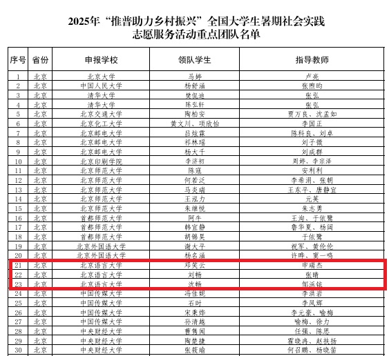 北语新闻网7月15日电(通讯员 闫家轶)为了深入贯彻落实党的二十大关于“加大国家通用语言文字推广力度”的决策部署,服务铸牢中华民族共同体意识,助力乡村振兴战略实施,教育部、共青团中央联合组织开展2025年“推普助力乡村振兴”全国大学生暑期社会实践志愿服务活动。经严格评审,我校三支团队以扎实的实践方案和鲜明的专业特色成功入选全国重点团队,彰显了北语学子服务国家战略的使命担当。