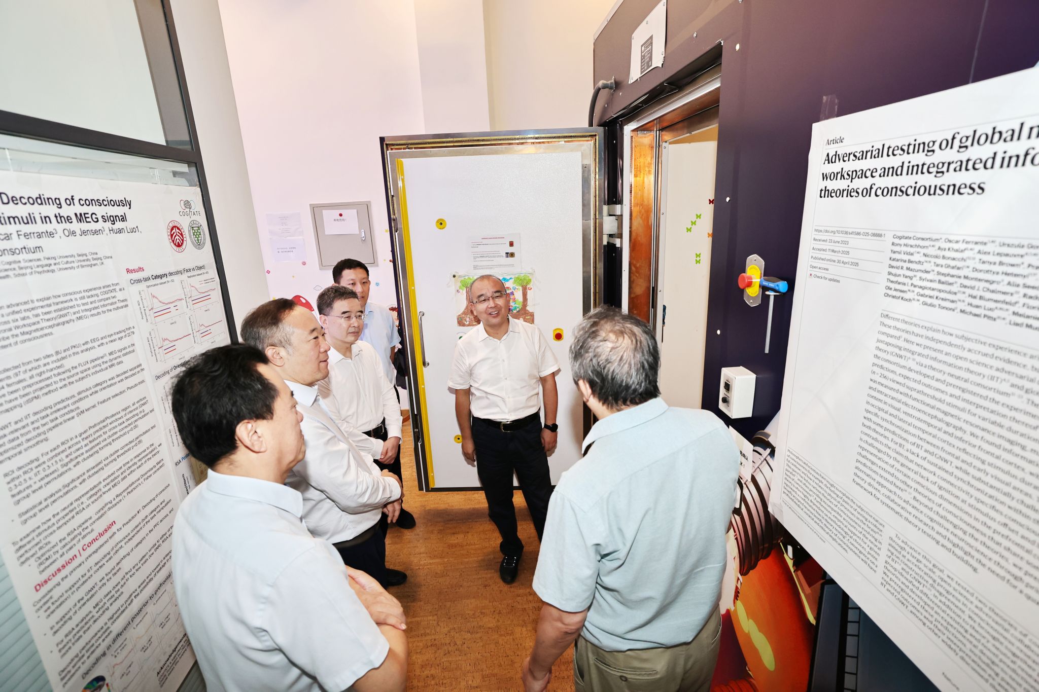 在语言认知科学教育部重点实验室,于英杰听取了该实验室为我校言语听觉学科建设、科学研究、人才培养、技术研发和社会服务提供的重要支撑作用,肯定了我校实验室建设缩短了该领域与国际先进水平的差距,希望强化与相关国家重点实验室合作共建,优势互补。