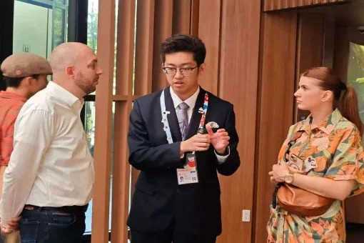 在此次大阪世博会中,张雨阳迎来了一次特殊的接待任务——服务来自家乡大连市的代表团。这次任务于他而言,远不是一次简单的接待,“那一刻的感觉很奇妙,万里之外遇到家乡的‘大家长’们,特别亲近!”他回忆道。代表团赞许的目光与殷切的叮嘱,让他肩头仿佛多了一份沉甸甸的期许。“站在国际舞台上讲述中国故事,本身就是一种责任。而当听故事的人里有来自家乡的‘亲人’时,这份责任瞬间变得无比具体。”张雨阳意识到,青年人的担当不仅在于放眼世界的胸怀,更在于心系故乡的深厚情感。这份在大阪世博会萌生的赤子情怀,成为张雨阳本次志愿服务之旅中珍贵的礼物,也照亮了他服务家乡、报效桑梓的前行之路。他暗下决心,未来要将世博会上汲取的国际视野与交流经验转化成未来建设家乡的养分。