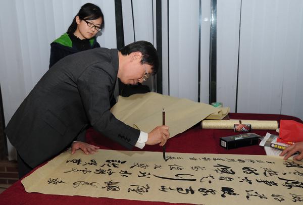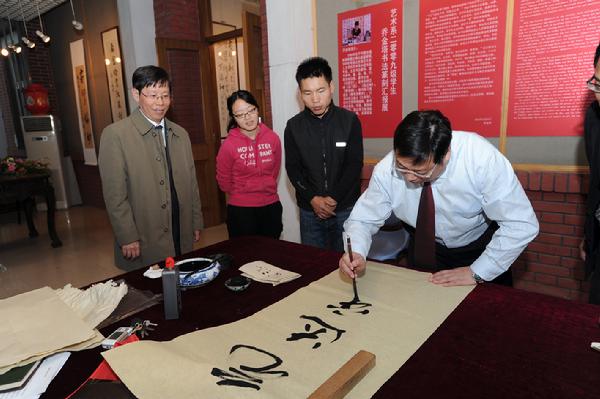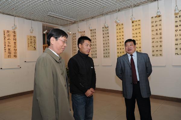 10月18日,我校艺术系中国书画专业乔金塔同学书法篆刻汇报展在人文学院艺术展厅开幕。李宇明书记、崔希亮校长和许多师生前往观看。