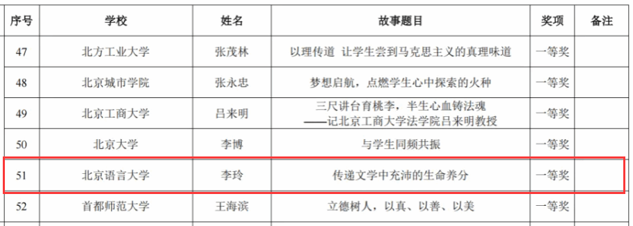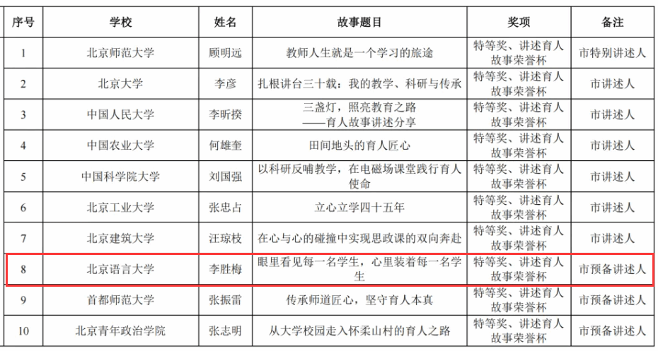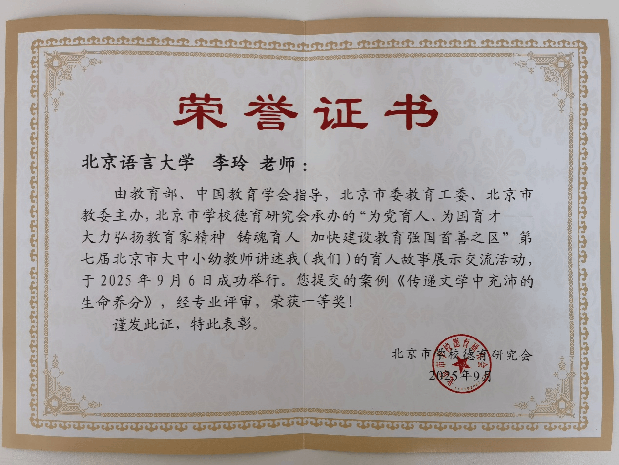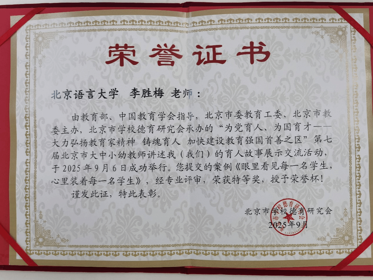 北语新闻网9月11日电(通讯员 杨曦悦)9月6日,由教育部、中国教育学会指导,北京市委教育工委、北京市教委主办,北京市学校德育研究会承办的第七届北京市大中小幼教师讲述育人故事展示交流活动在京举行。我校推荐报送的2个育人故事案例在全市近500个案例中脱颖而出,取得优异成绩。经专业评审,我校教师教育学院李胜梅教授荣获特等奖和讲述育人故事荣誉杯,文学院李玲教授荣获一等奖。