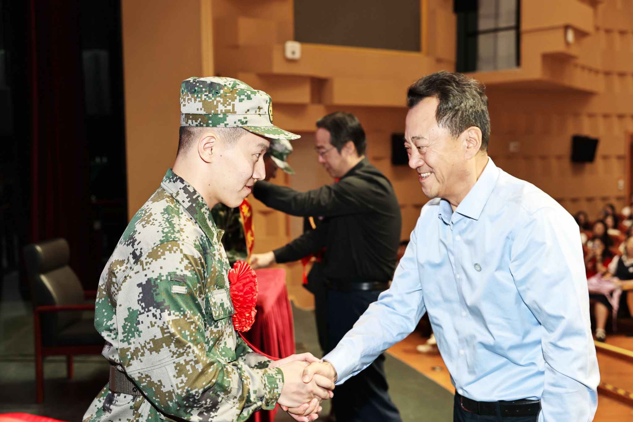 北语新闻网9月25日电(通讯员 钦浩 摄影 魏达 张东泉)2025年9月,北语六名优秀本科生、研究生光荣参军入伍。12日下午,学校在书记“开学第一课”上庄重举行了新兵出征仪式,校党委书记倪海东为学生佩戴光荣花、副校长黄益方为学生佩戴绶带,武装部、学院负责人、辅导员老师、全体新生共同见证了这一光荣时刻。