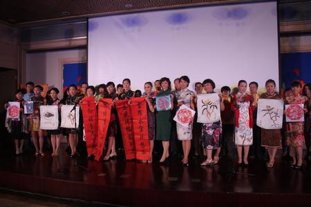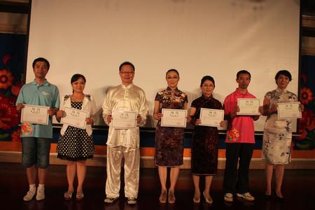 最后,学员们带来了精彩的汇报演出。演出分为武之风、艺之雅、文之颂三个篇章。13位学员身着月光白太极服,共同表演陈氏太极拳,刚与柔在一招一式完美结合,将太极这一古老功夫演绎得淋漓尽致;赵君明的气功表演赢得了全场雷鸣般的掌声。杨婷婷的民族舞蹈《茉莉花》揭开了“艺之雅”的序幕,袁瑛演唱歌曲《甜蜜蜜》,歌声轻柔曼妙;李琰改编黄梅戏《女驸马》,用戏曲唱出难忘的培训时光;17位女学员身着各种款式的旗袍,婀娜多姿,一一亮相;曾奇斌等展示了在这次培训学到的中华才艺——书法、国画和剪纸。“文之颂”——学员李春安创作了大型诗歌,培训专家与十名学员一同朗诵,用诗唱咏对老师们的感谢和对未来的希望,时而激昂时而温婉,汇报演出在充满豪情的诗歌中画上了句号。