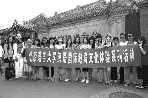 “还要加深对中国文化的感性认识才行。”北京语言大学又把凝聚着知识内涵的物质文化遗产和非物质文化遗产列入留学生教育体系,把语言实习与感悟中华文化融为一体,给留学生们安排了丰富多彩的语言实践和社会实践,他们把这一传承与弘扬中华文化的第二个模式总结为“走读中国”。“古人说‘读万卷书,行万里路’。亲眼看一看的效果往往会比单纯记忆书本上要好得多。”郭鹏院长说道:“北语坐落在首都北京,我们首先就充分利用这一历史文化名城的‘走读’资源。例如学校与北京湖广会馆共建了留学生中华文化体验基地,通过近距离接触京城会馆文化和京剧来体验传统文化的优雅;组织留学生参加‘北京民俗游’,在京城‘百工坊’、老舍茶馆、天桥乐茶园、北京老字号体验京味文化的细腻。”这种亲身的体验,使北语的留学生对中国文化的了解不再是走马观花,而是比较深层次地对中国文化产生了喜爱和共鸣,增强了对中国的亲近感。
