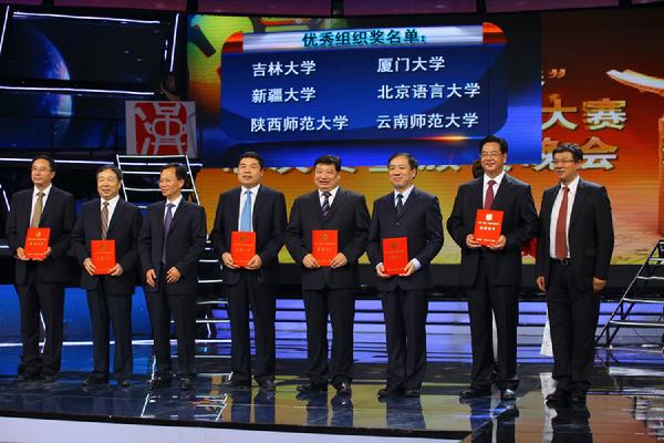 “汉语桥”在华留学生汉语大赛由中央电视台和国家汉办/孔子学院总部联合主办,至今已成功举办4届,在在华留学生中反响很大。同往届相比,此次比赛赛事规模更大,选手实力更强,共有来自150余所高校47个国家的百名学生入围决赛。在8月31日的总决赛暨颁奖晚会上,更有中央政治局委员、国务委员刘延东,教育部部长袁贵仁和国家广电总局局长蔡赴朝等领导出席并亲自为获奖选手颁奖。我校作为25个承办高校之一,同其它5所高校一起获得此次大赛的最佳组织奖,李宇明书记代表我校上台接受颁奖。