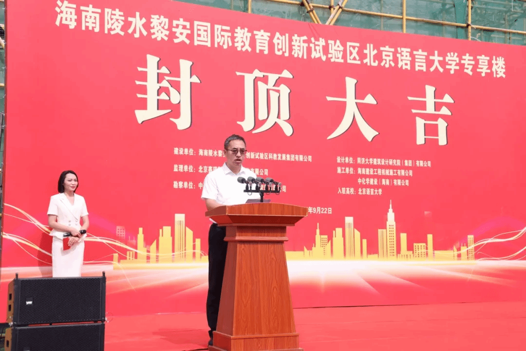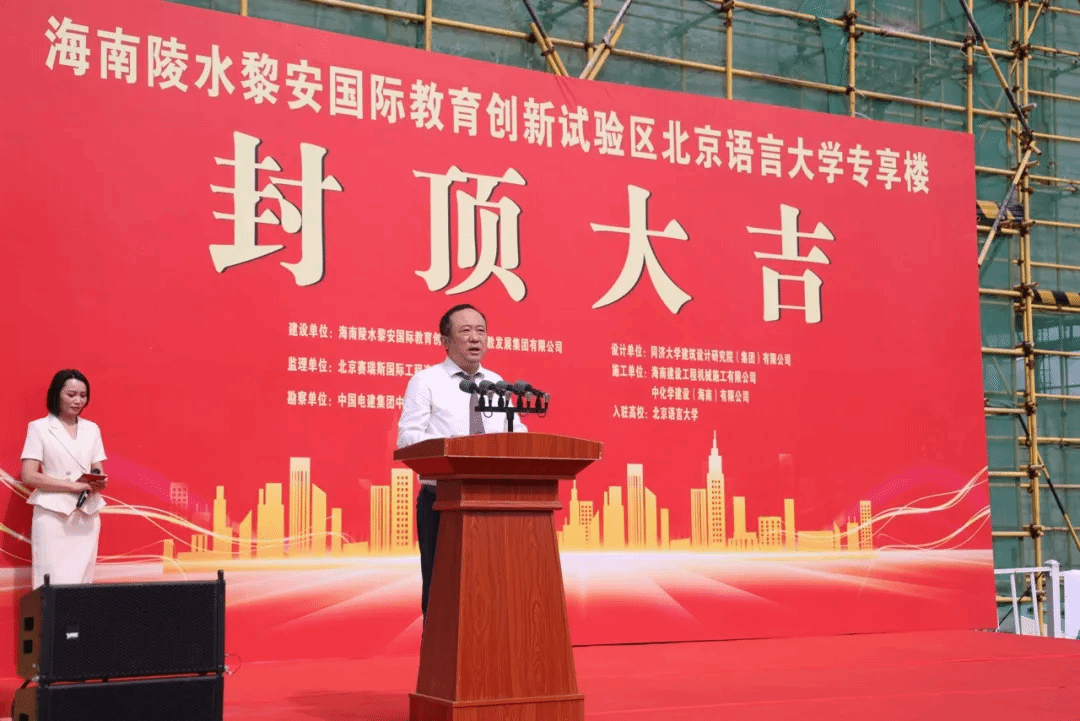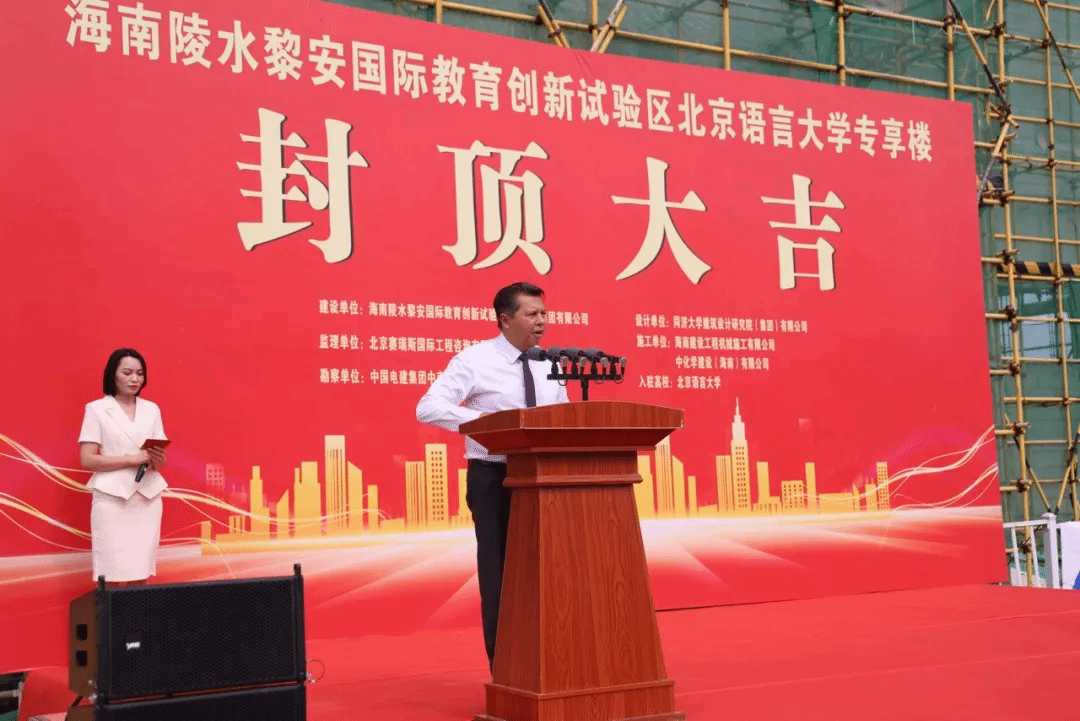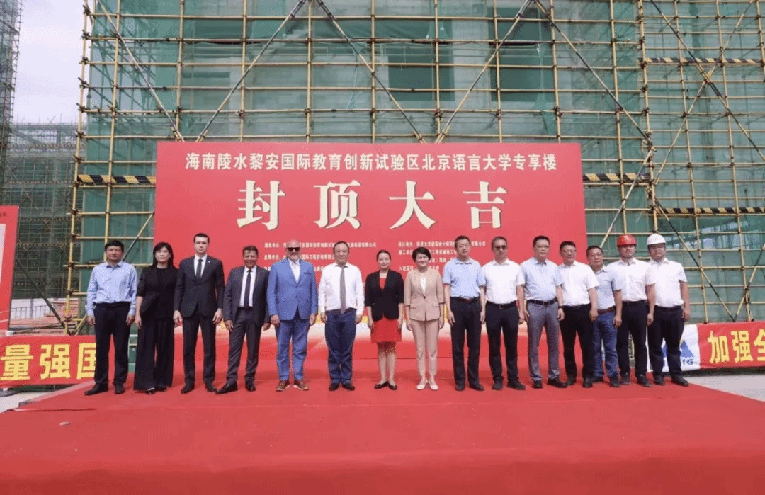 北语新闻网9月30日电(通讯员 张扬、张鑫 摄影 陈闻 等)9月22日,北京语言大学专享楼在海南陵水黎安国际教育创新试验区(以下简称“试验区”)正式封顶。北京语言大学校长段鹏,海南省委教育工委委员、省教育厅党组成员、副厅长崔莹,海南省陵水黎族自治县委副书记、县长罗桦,海南省陵水黎安国际教育创新试验区管理局党委委员、常务副局长刘明,海南省陵水黎安国际教育创新试验区管理局党委委员、副局长、科教发展集团有限公司党委书记、董事长邹文涛,海南陵水黎安国际教育创新试验区管理局党委委员、局长助理、试验区科教发展集团有限公司总经理杨钊,法国驻广州总领事馆科技与高等教育合作领事敖礼威(Aurélien Decombe),法国克莱蒙高等商学院校长理查德·索帕诺(Richard Soparnot),美国东北州立大学校长罗德尼·汉利(Rodney HANLEY)等领导嘉宾,以及参建单位代表、师生代表、工人代表齐聚现场,共同见证这一里程碑时刻。