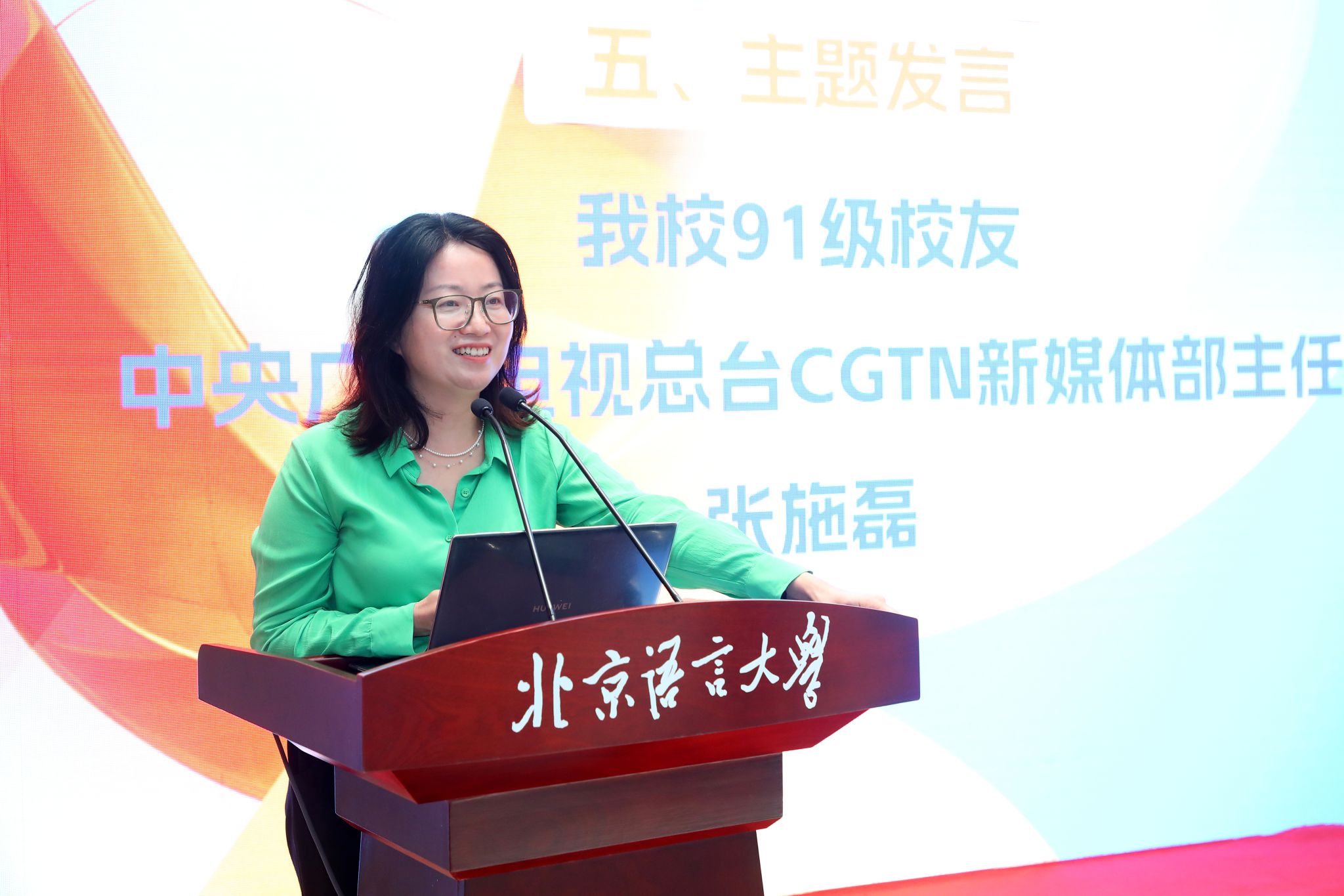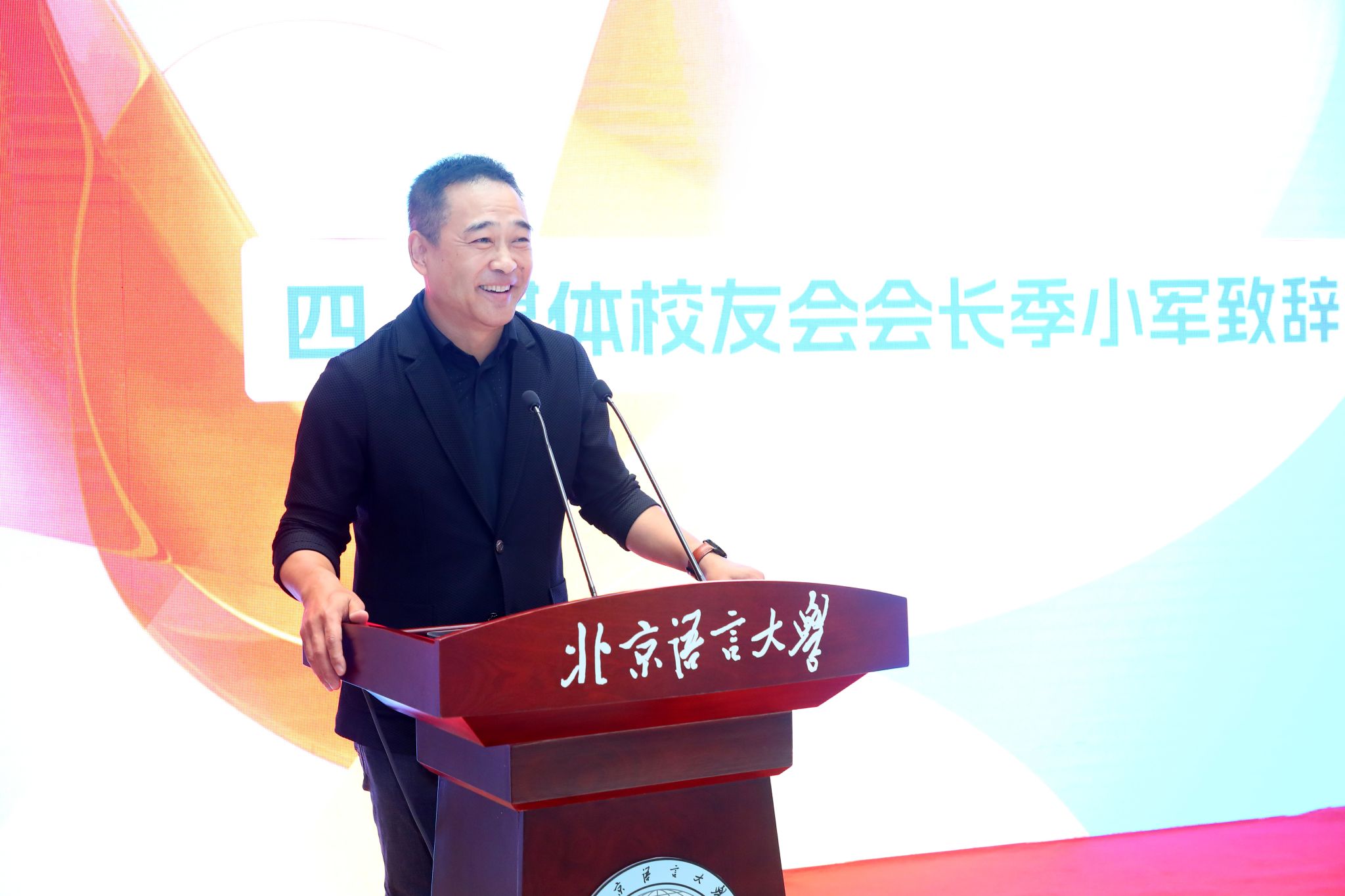 我校90级优秀校友、媒体校友会会长、著名主持人季小军校友致辞。他深情追述了在北语的学生时光,从自身经历出发,串联了北语与媒体行业的深度链接。为什么一所以语言教育为特点的学校有很多毕业生从事媒体行业?季小军认为,北语开放包容的态度,为毕业生筑牢了媒体职业的根基。此外,学校培养了学生优秀的学习能力、语言基础、沟通能力和国际视野,这正是媒体行业必不可少的综合素养。他代表媒体校友会发起倡议,希望所有成员赓续北语精神、讲好北语故事、增进校友情谊、整合行业资源、助力学校发展。