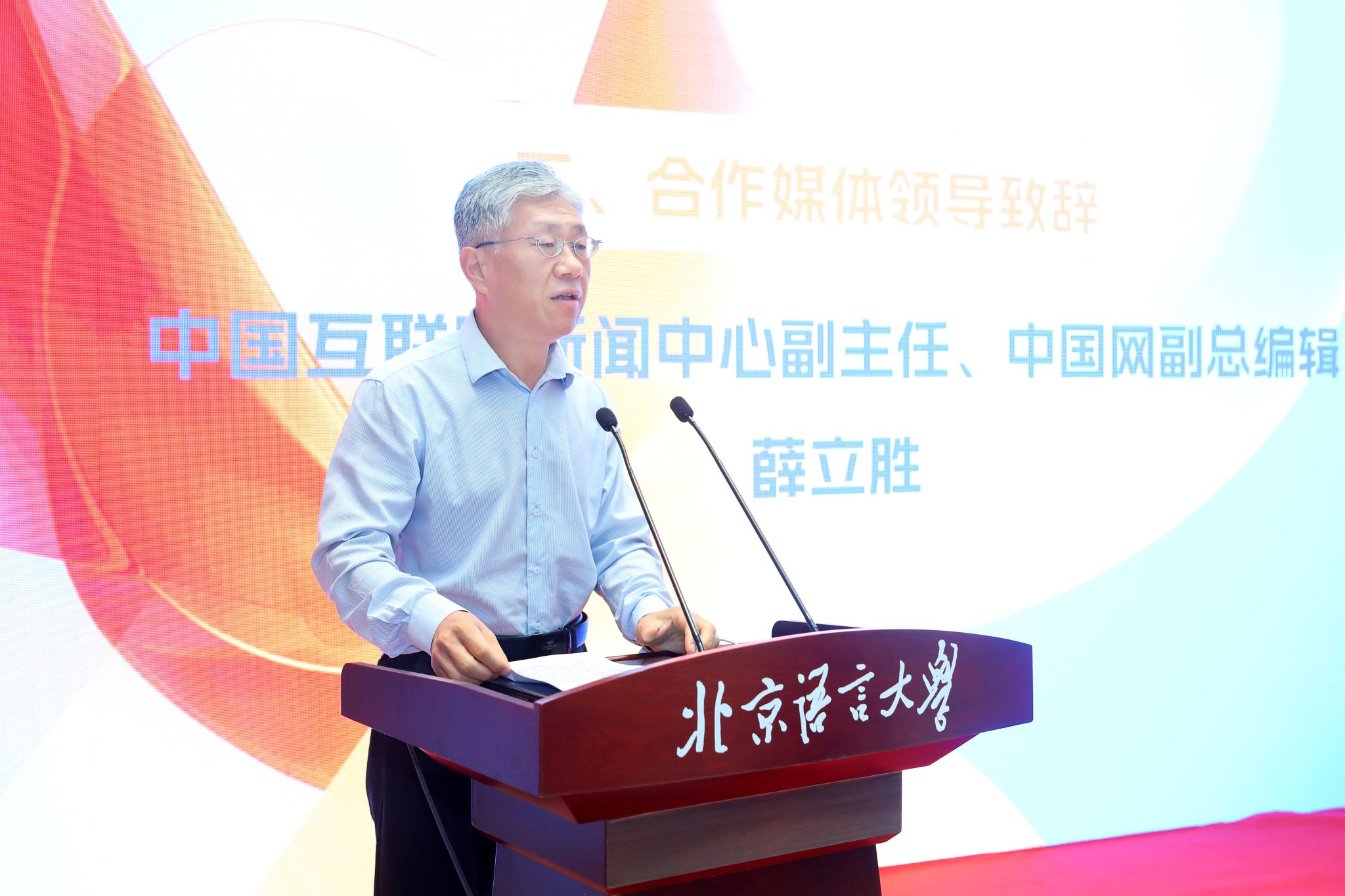中国互联网新闻中心副主任、中国网副总编辑薛立胜代表合作媒体领导致辞,他提到中国网与北京语言大学的多次深度合作,并表示在国际传播的道路上,中国网愿与北语一道深化合作,盘活人才、科研、文化等高校资源,锚定政、产、学、研、用深度融合方向,让青年力量、智库力量成为传播主力,让中国故事“破圈出海”。