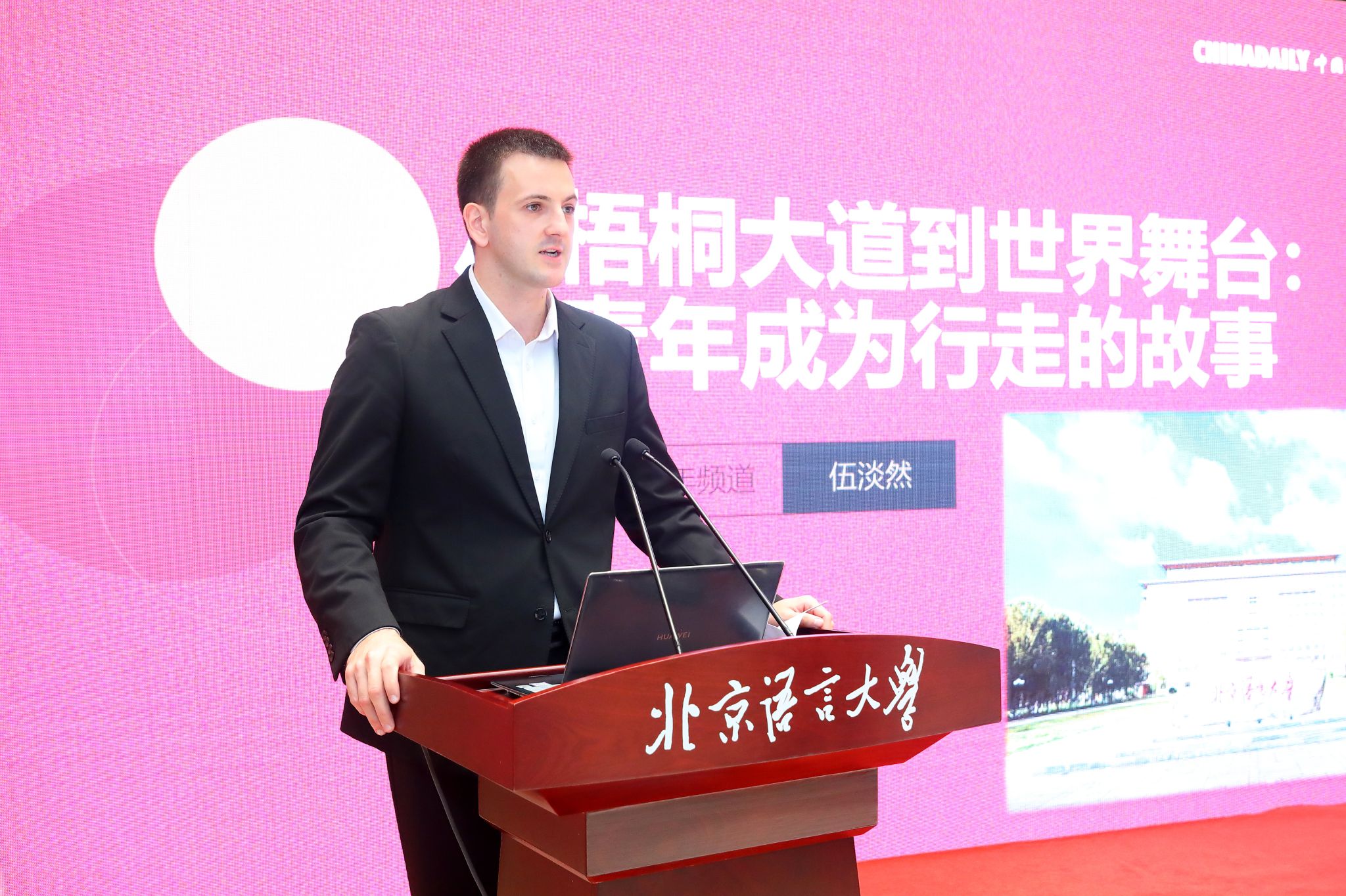我校19级优秀校友、中国日报社外籍记者伍淡然(美国)以《从梧桐大道到世界舞台:让青年成为行走的故事》为题,讲述他从大学走进新闻世界的故事,他鼓励国际学生要多记录“在场”的中国生活,珍视情感真挚的真诚表达,认为当青年被点燃探索的热情,自愿分享故事,北语的国际形象便不言自明。