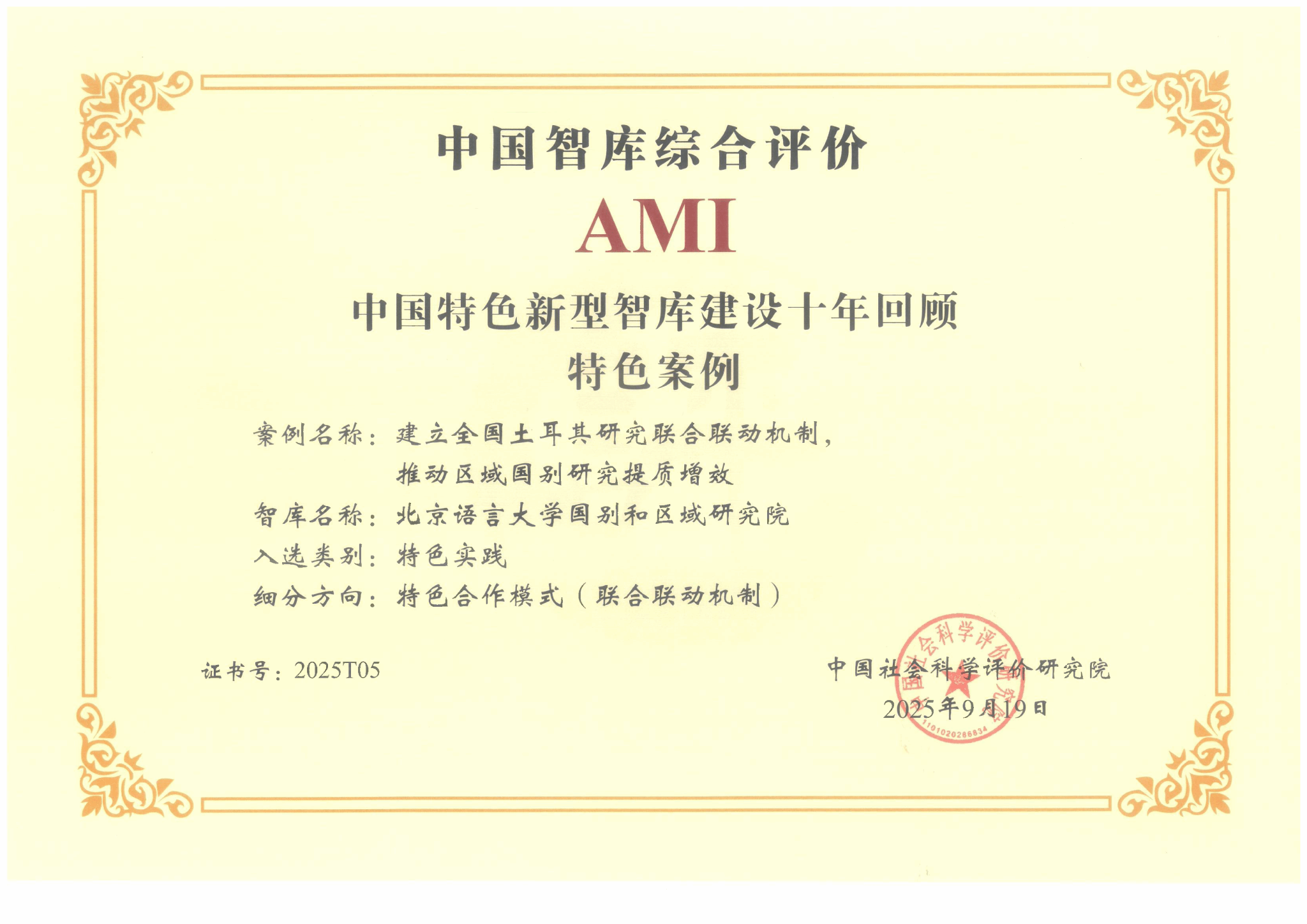 国别和区域研究院凭借在区域国别研究领域的突出贡献,成功成为中国智库综合评价(AMI)智库入库单位。同时,学院提交的“建设全国土耳其研究联合联动机制,推动区域国别研究提质增效”案例,荣获(AMI)中国特色新型智库建设十年回顾特色案例,这一成果标志着我校在区域国别研究领域的实践探索得到了高度认可。