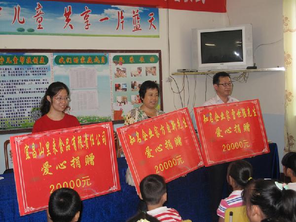 在捐赠仪式上,爱心人士雷世猛、方自新和山里来食品有限公司的张明星为三峡移民留守儿童慷慨解囊,真诚捐助6万元来改善他们的学习和生活条件。
