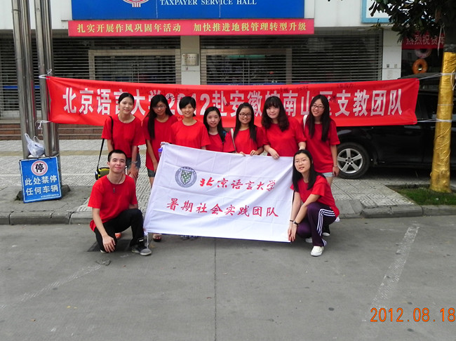 8月18日下午,在结束当日教学任务后,北语2012赴安徽皖南山区支教团队全体队员聚集在安徽省东至县城中央街头,向当地市民进行了英语口语学习宣传活动,旨在提高当地普通市民的英语学习意识,增强市民英语基础会话能力。
