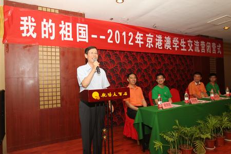 7月18日晚,“我的祖国—2012年京港澳学生交流营”闭营仪式在承德隆重举行。北京语言大学校长崔希亮、中央人民政府驻澳联络办广东联络部副部长左曙刚、香港新一代文化协会总干事苏祉祺、澳门中华学生联合总会副理事长梁子豪等出席了闭营式。闭营仪式由北京语言大学国际合作与交流处处长赵伟民主持。近300名京港澳三地营员参加了闭营式。