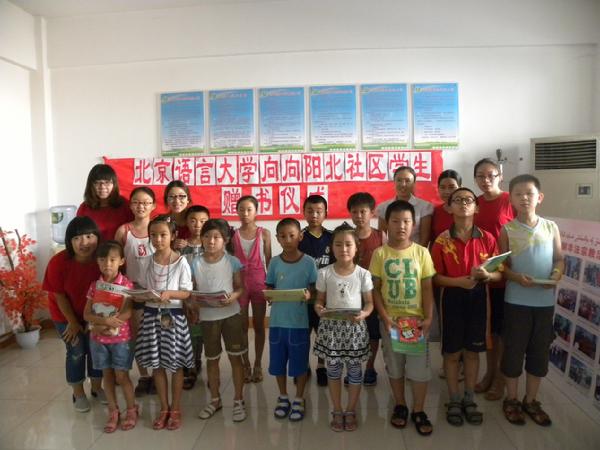 北京语言大学向向阳北社区学生赠书仪式于2012年7月19日下午顺利进行,向阳北社区党支部书记潘兰珍等人出席了本次仪式。我校赴克拉玛依支教团队的五名队员向向阳北社区的12名学生赠送书籍。