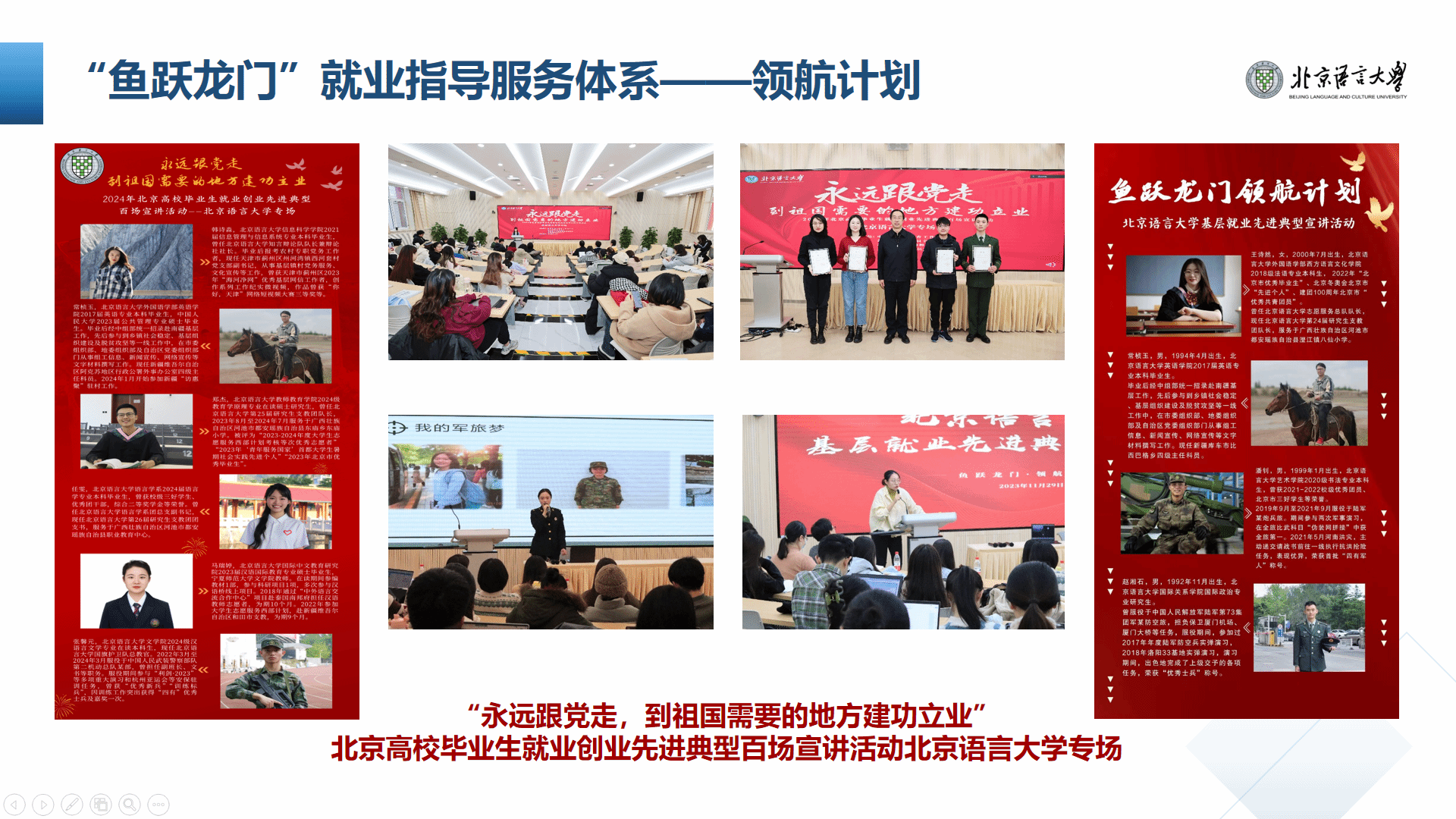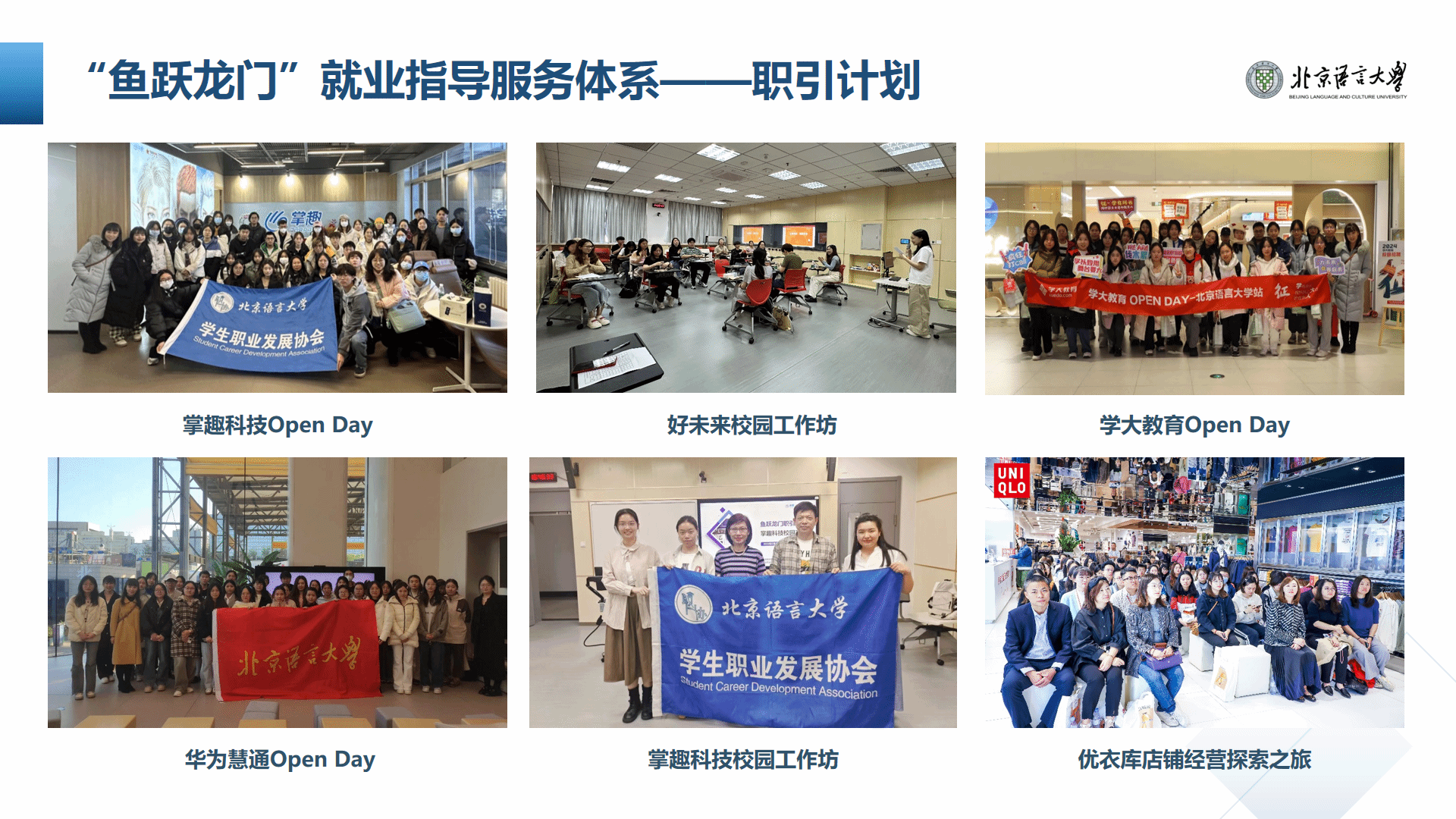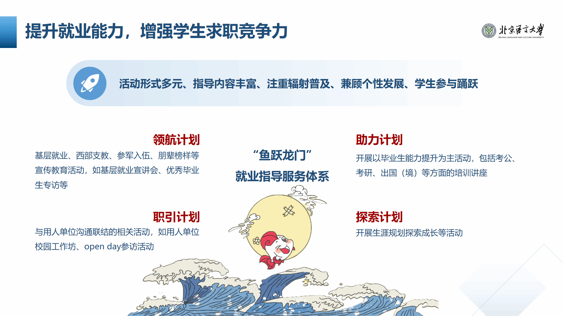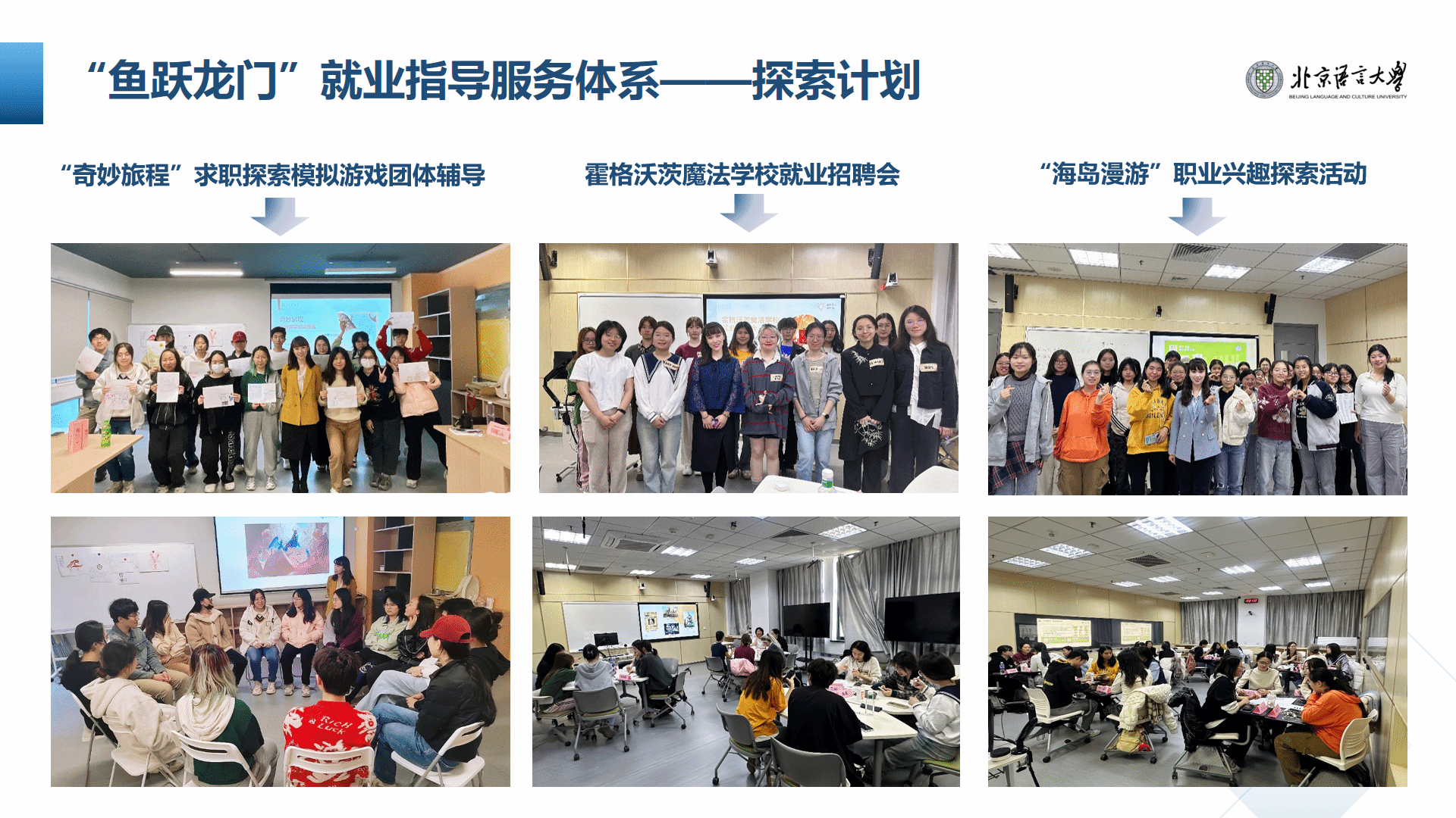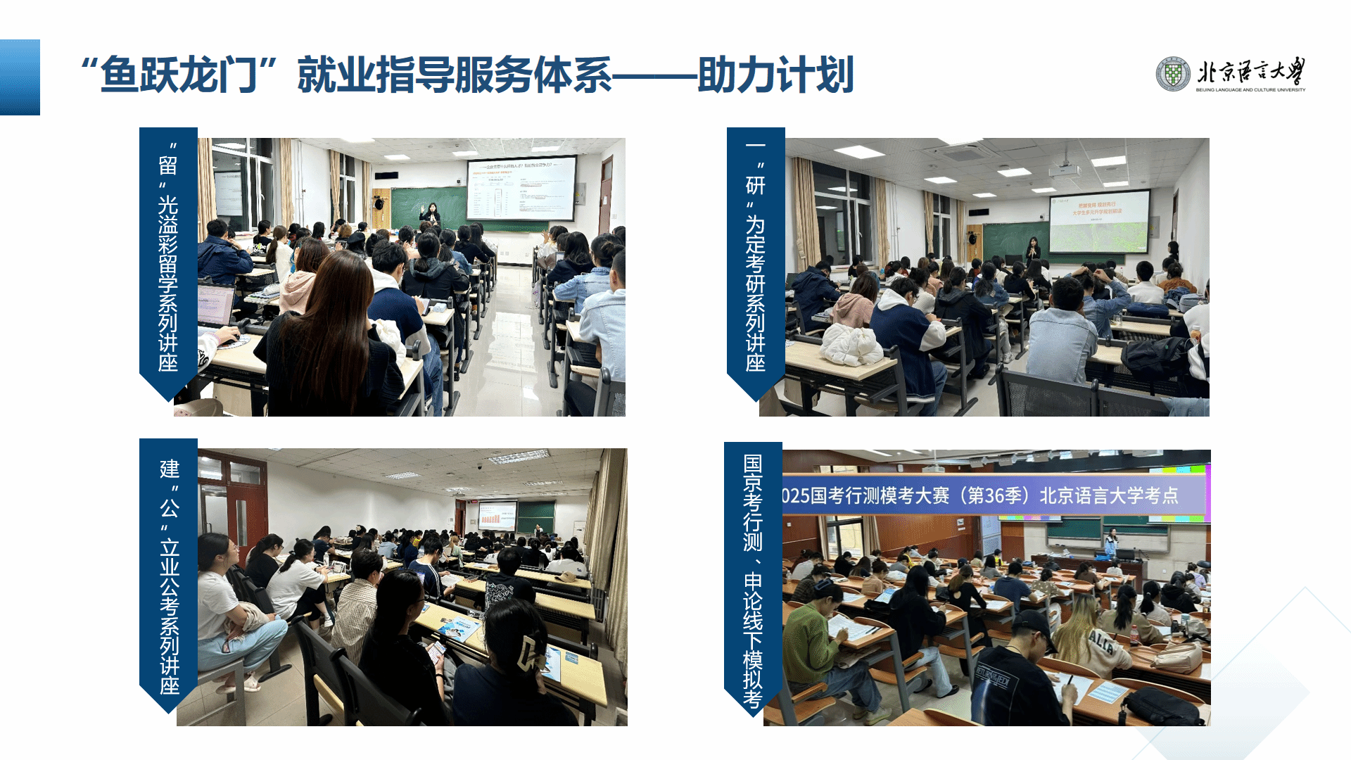 学校持续践行“以学生为中心”的工作理念,不断提升就业分类指导工作水平。打造“鱼跃龙门”就业指导服务体系,设置“鱼跃龙门”领航计划、职引计划、助力计划、探索计划等多个板块,从朋辈榜样宣传引领、行业名企沟通联结、个人能力提升锻炼、生涯规划探索成长四个维度入手开展就业创业分类指导活动,具有“活动形式多元、指导内容丰富、注重辐射普及、兼顾个性发展、学生参与踊跃”的特点。自2024年起至今,已成功举办基层就业宣传引领、建“公”立业公考系列讲座、一“研”为定考研系列讲座、“留”光溢彩留学系列讲座、青云“职”上事业单位备考讲座、国京考行测和申论线下模拟考试、简历面试指导活动、用人单位企业开放日参访、优秀毕业生专访等近260期活动。2025年9月秋季学期的各类就业指导活动已如期与同学们见面,期待更多同学积极参与。