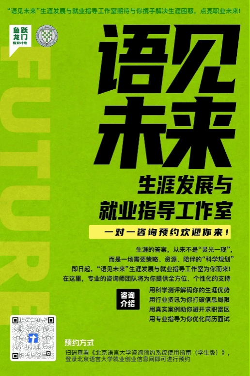 为进一步提升学校生涯教育工作水平,学校就业创业指导中心牵头成立北京语言大学“语见未来”生涯发展与就业指导工作室,为全体在籍中国本科生、研究生提供“一对一”生涯咨询服务。咨询内容包括职业兴趣与能力测评、职业目标定位、职业发展路径规划、求职简历修改、面试技巧指导、就业政策解析、留学规划咨询、就业心理疏导等多个方向。2025年秋季学期的咨询预约服务已全面开启,来自高校、企业、校友的专兼职咨询师将为同学们提供从生涯探索到就业落地的全周期支持。