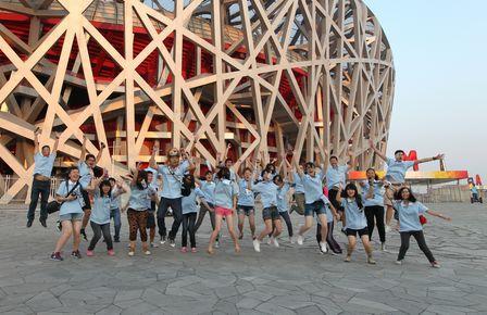 当汽车靠近鸟巢和水立方时,营员们就显得十分兴奋,纷纷拿起相机和手机拍照,对鸟巢的宏伟和水立方的奇特赞不绝口。刚进入公园,大家迫不及待地向鸟巢跑去,在鸟巢前,营员们纷纷摆出不同造型,合影留念。