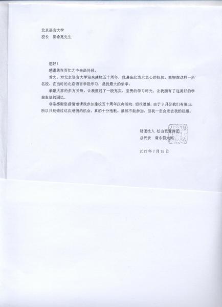 日前,我校校友、著名芭蕾舞艺术家、日本松山芭蕾舞团总代表清水哲太郎先生给母校50周年校庆发来贺词。
