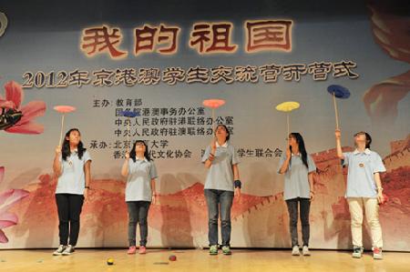 7月13日晚,“我的祖国——2012年京港澳学生交流营”开营晚会在主楼209举行,来自北京、香港、澳门的200多位营员相聚于此,在欢声笑语中度过了别开生面的开营第一夜。