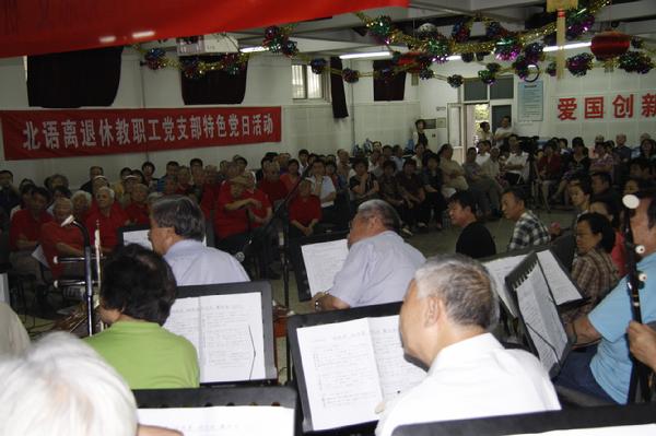 活动伊始,由离退休党支部和机关党支部选派的党员代表共同组成五个方队就发起了拉歌活动,歌声嘹亮,拉歌号子此起彼伏,声势浩大,一派欢乐祥和。活动中,穿插着离退休同志和机关总支的精彩表演,使活动现场变得更加挚热。由83岁离休老党员王俊朗同志原创的三句半“党的领导就是好”把联欢活动带向高潮。四位老同志个个精神抖擞,年过八旬的离休老党员刘素珍同志更是精神焕发不减当年。他们用最真实的情感和最生动的表演技巧,歌颂了我们国家实行离退休政策30年以来,学校各级党组织认真学习贯彻中央文件精神,让离退休老同志老有所为、老有所养、老有所依、老有所乐、老有所学,过上幸福祥和的退休生活。耄耋老人与年轻党员一同演唱红色歌曲,九十三高龄的离休老党员郭菊茹在家人的陪同下专门打车参加此次活动,她说,我是一名老党员,我只要能动,就一定要来参加党的活动。总支组织的“大家唱”活动是我最喜欢的,越唱党员越有集体精神,心里越舒畅。