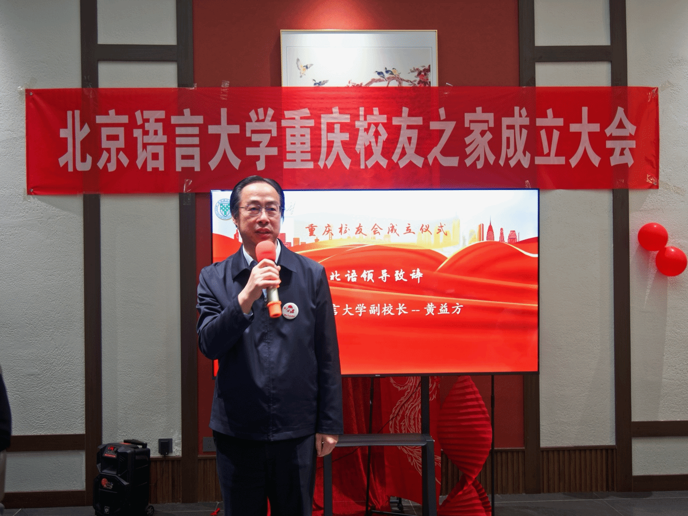 黄益方副校长在致辞中向关心支持母校发展的重庆校友致以诚挚问候,向重庆校友之家的成立致以热烈祝贺,向到场的各位校友表示诚挚欢迎。黄益方副校长回顾了学校六十余载与国家共命运的峥嵘岁月。被称为“小联合国”的北京语言大学在语言教育、文化传播等领域使命独特、成就卓越,特别是近年来,在人才培养、学科建设、服务国家战略和社会经济发展、文化传承创新、教育对外开放等领域均取得突破性进展,办学水平与社会影响力实现显著提升,这些成绩的取得,离不开广大校友的持续关注和大力支持。他表示,校友是学校宝贵的财富,学校始终将校友工作置于重要位置,目前已在多地建立校友组织,校友之家是母校延伸至各地的“情感驿站”,学校将全力支持重庆校友之家建设,期待校友组织成为汇聚智慧、共促发展的重要平台。希望以此为纽带,推动校地合作、校企联动,助力校友成长与母校发展实现双赢,同时他向所有校友发出热忱邀请:“常回母校看看,看看熟悉的校园,聊聊当年的故事,也见证母校的新变化。”