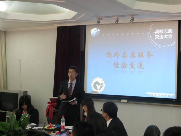 在轻松活跃的现场气氛子中,各位同学开始交流举办志愿服务活动的经验。首先是校外志愿服务经验交流。此环节中大家畅所欲言,说出志愿活动筹划、举办过程中的种种问题,并针对这些问题提出了很多建设性建议。交流过程中,大家针对的问题主要有以下四点。第一是打工子弟小学支教问题。大学生课业紧张,课余活动丰富,很难长时间支教。但这并不利于受助孩子的学习和成长。因此造成招募志愿者时应招同学不足,使受助校方和学生对于志愿者的支教行为产生排斥心理。我校同学表示,支教活动可以针对劳动人口输出大省展开,在假期帮助孩子的学习并保证他们的安全。在活动之后,要注重对志愿者进行感谢,对他们给予肯定。第二是志愿者的招募、管理和培训机制不够完善,有些学校代表提出志愿者招募时同学积极性不高,有些学校分校区的地点比较偏远,给志愿者管理环节造成了很大的困难。我校同学建议,在招募留学生志愿者时,直接发放传单会引起留学生的反感情绪。通过利用工作人员的同学、语伴等人际关系招募留学生志愿者更加有效。第三是有些学校的志愿服务总队项目比较单一,希望借助其他高校经验丰富志愿项目种类。最后一点是组织构架的合理性问题。地质大学代表建议可以使每个项目部门自行成立一个支队,扩大志愿总队的规模。