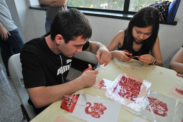 教师代表王瑞烽老师的互动式发言,引起了同学们的积极回应。学生代表白俄罗斯的叶诚同学用标准、流利的汉语表达了同学们对中华传统文化的向往和对中国语言的无限热爱。开幕式上,师生们欢聚一堂,共同欣赏了来自北京燕山情艺术团演员们的传统艺术表演,喝彩声此起彼伏。演出结束后,同学们意犹未尽,争先恐后地参与到学院为他们精心准备的中国传统手工艺展示和制作的活动中去。挥毫蘸墨学书法,感受着中国的书法艺术;欣赏着精美的内画工艺;在老艺人的指导下,动手捏个面人,剪一幅剪纸;亲身体验一下京剧画脸的感觉,再戴上凤冠霞佩、穿上戏服,与中国传统文化来一次真正的零距离接触。