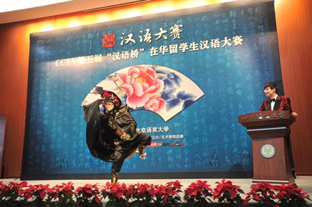 “汉语桥”在华留学生汉语大赛由中央电视台和国家汉办/孔子学院总部联合主办,至今已成功举办4届,在在华外国留学生中反响很大,我校学生曾在往届比赛中获得总冠军和金奖。今年北京赛区的预赛由我校承办,这也是我校第三次承办此项比赛。此次预赛是全国25个赛区预选赛的最后一场,共有来自北京地区13所高校的43名留学生参加,我校人文学院冯惟钢老师担任评委。