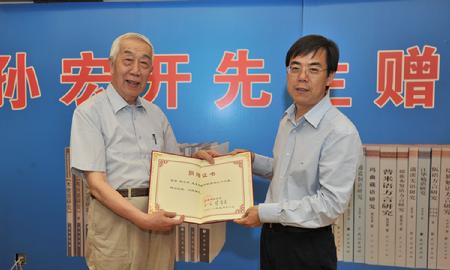 孙宏开先生此次为我校赠送了由他主编或合作主编的《中国的语言》、《汉藏语同源词研究》丛书、《中国新发现语言研究》丛书、《中国少数民族语言方言研究》丛书等90余部著作。曹志耘副校长代表学校接受了孙先生的赠书,并为孙先生颁发了赠书证书。
