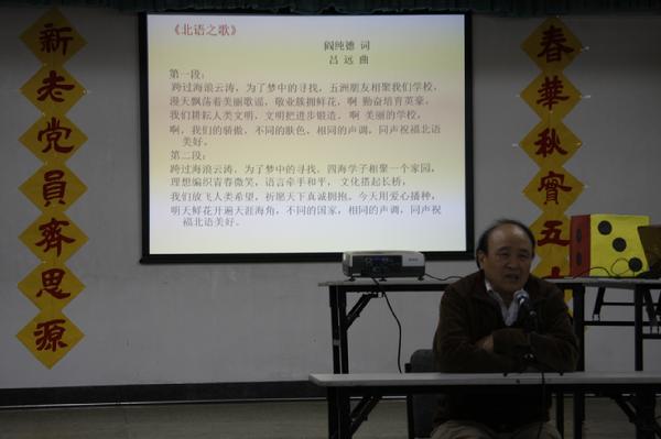 本次活动主题鲜明,内容丰富,环节有趣,生动活泼,别开生面。在活动中,关工委副主老师首先讲话:他向同学们介绍了学校从建立到现在50年的发展历程,并向学生们提出了了解北语、热爱北语、传承北语精神的殷切希望。接下来,退休教职工第17党支部的老师为同学们讲述了1974年9月受学校全体教职员工的委托,给伟大领袖毛主席写信,请毛主席题写校名的亲身经历。第16党支部的老师为同学们讲述了2002年在学校40年校庆时,自己创作校歌歌词的亲身感受。在场的同学们了解了我校几十年前的一幕幕深受感染。老同志和同学们在《北语之歌》曲子的伴奏下唱起了校歌:“跨过海浪云涛,为了梦中的寻找,五洲朋友相聚我们学校,漫天飘荡着美丽歌谣,敬业簇拥鲜花,啊 勤奋培育英豪,我们耕耘人类文明,文明把进步锻造。优美的歌声回荡在会场里。接下来趣味性的知识竞赛开始了,红、蓝两队各有10名队员,5名老同志5名同学混合编队。知识答题都是有关学校50年来建立、发展的情况。更有趣的是回答正确的队有权掷色子,可以在学校的平面图上行走,看哪队先到终点争得冠军。比赛中红队领先,蓝队也始终紧追不舍,频频齐头并进。为了给与鼓励,老同志和同学们纷纷表演了精彩的文艺节目。最终红队先到达终点赢得冠军,会场上再次掀起高潮。