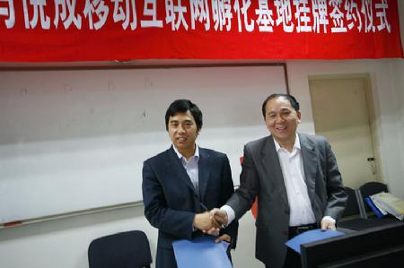 教务处刘伟处长与悦成移动互联网孵化基地耿赛猛副总经理共同为“北京语言大学移动互联网开发教学实践基地”揭牌,信科院刘贵龙院长与耿赛猛副总经理共同签署了“校外教学实践基地协议书”。