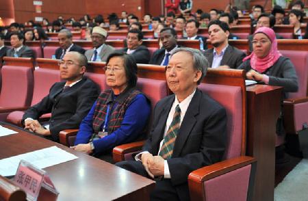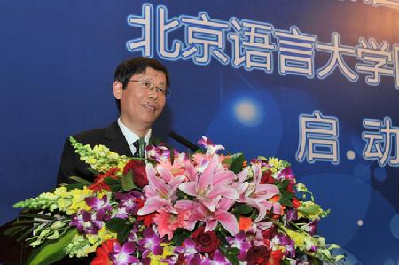 外交部副部长翟隽、全国政协常委中国伊斯兰教协会会长陈广元、北京第二外国语学院院长周烈、教育部国际司专家处处长聂瑞麟、教育部国际司亚非处处长吴劲松等,阿盟驻华代表处主任哈桑.沙布、阿拉伯国家驻华使团长苏丹大使穆罕默德.萨利赫等20余位阿拉伯国家的驻华大使、临时代办、公使、参赞,新华社外事局副局长吴毅宏、博联社总裁马晓霖、人民日报国际部副主任刘水明、《今日中国》杂志社总编助理王茂虎,以及文化部、北京大学、北京外国语大学、对外经济贸易大学、北京第二外国语学院的专家学者,我校校长崔希亮、党委副书记赵旻、副校长曹志耘、戚德祥、董立均出席了启动仪式。